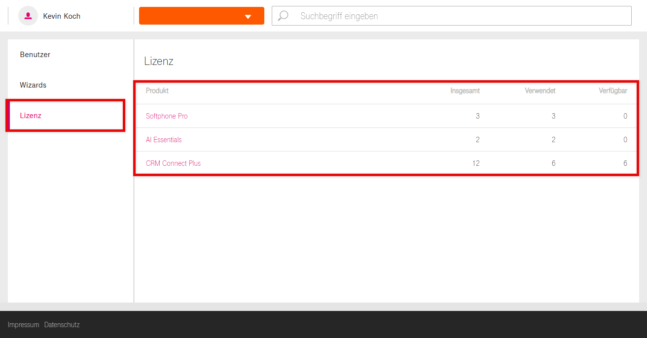 ⇒ Hier sehen Sie, wie viele Produktlizenzen verwendet werden oder verfügbar sind, sowie die Gesamtzahl der Lizenzen.