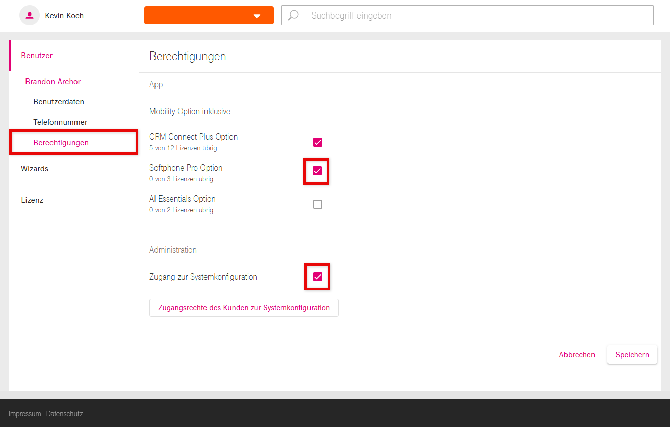 Aktivieren oder deaktivieren Sie das Kontrollkästchen neben Zugang zur Systemkonfiguration, um diesem Benutzer Administratorrechte zuzuweisen oder zu entziehen.