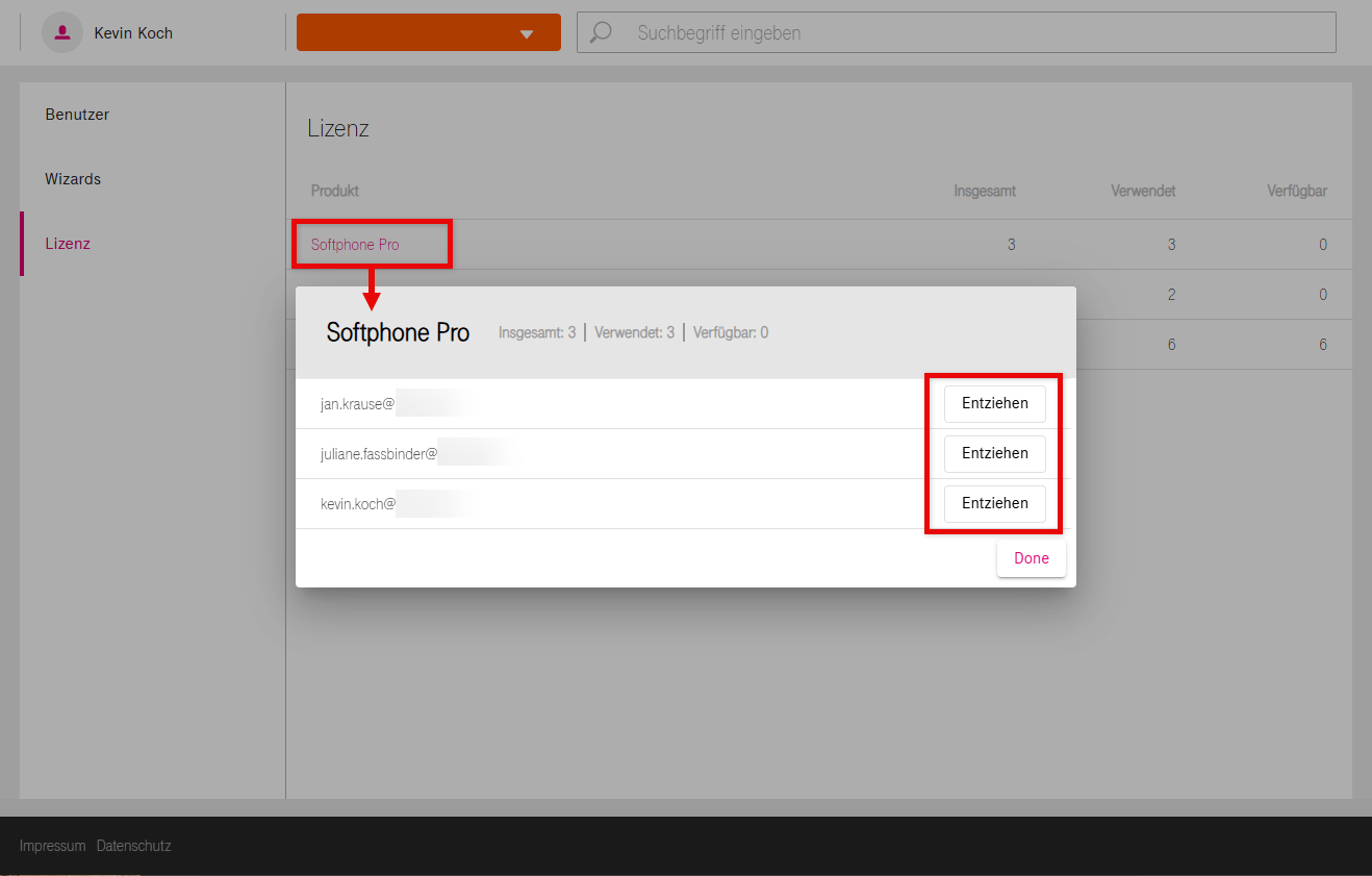 Klicken Sie auf ein Produkt (im Beispiel hier: Softphone Pro), um anzuzeigen, welche Benutzer über Lizenzen verfügen.