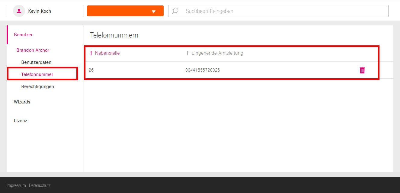 Im Reiter Telefonnummer können Sie die Nebenstelle entfernen.