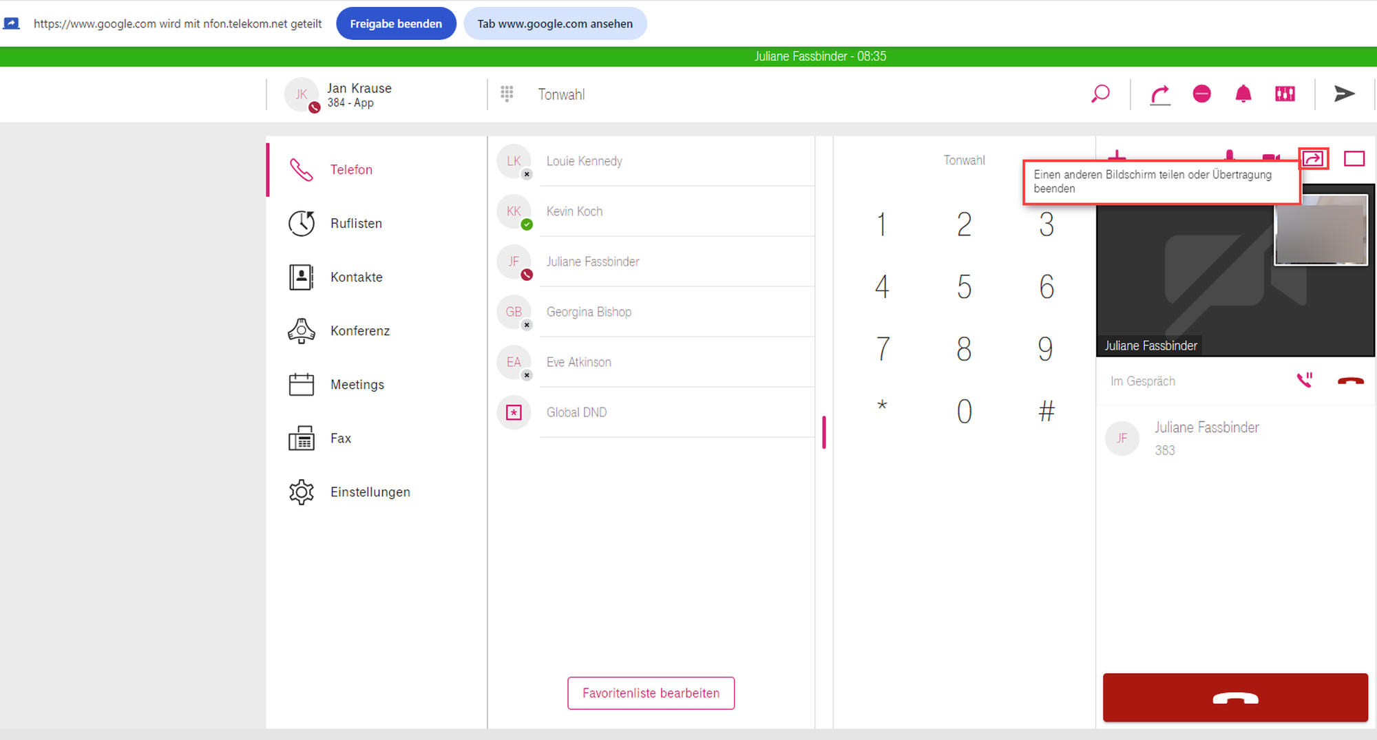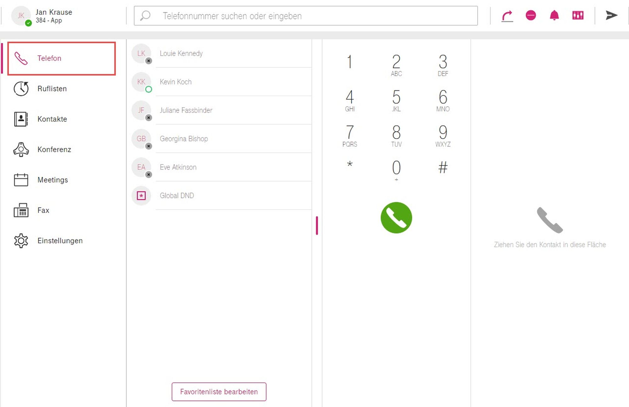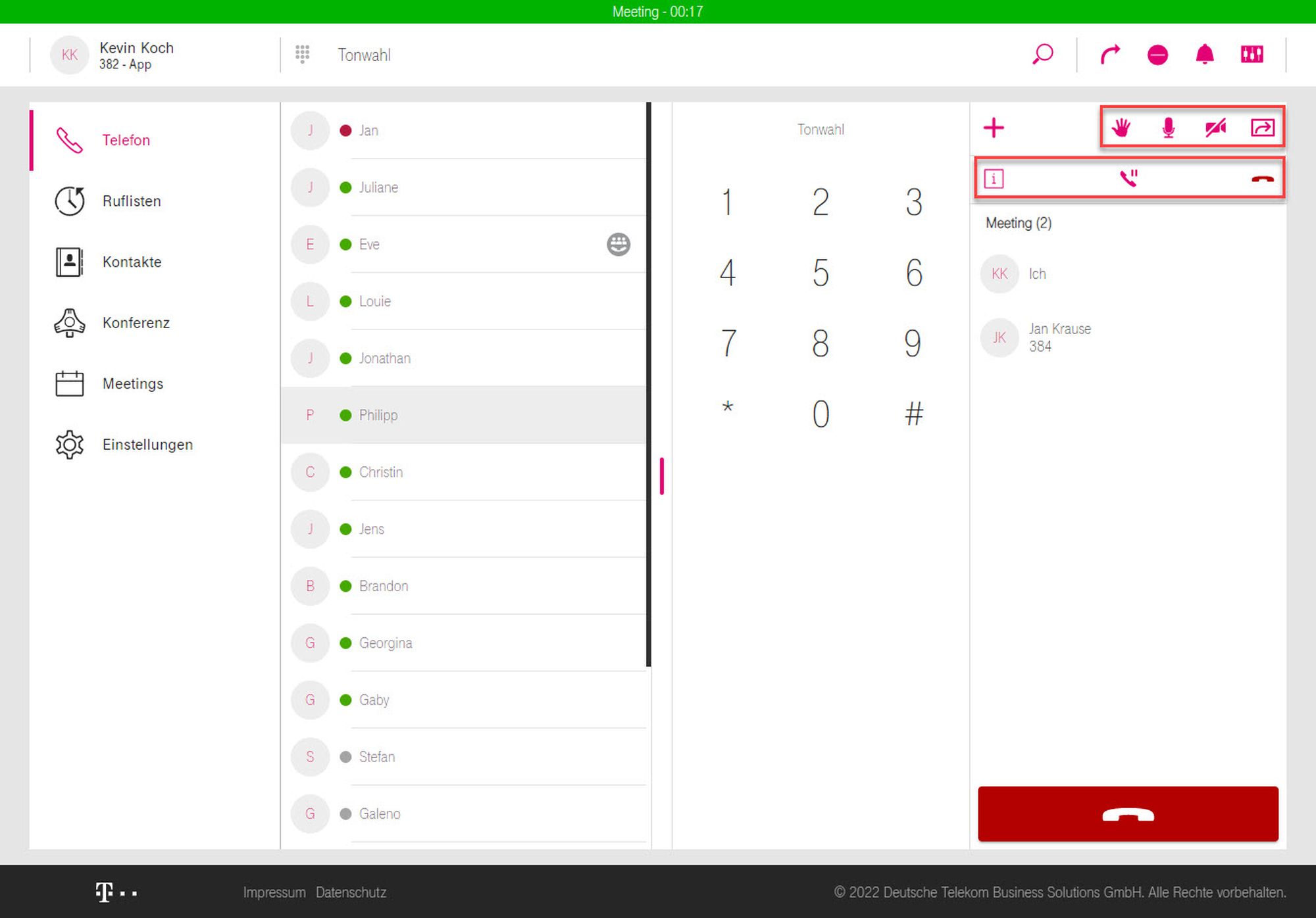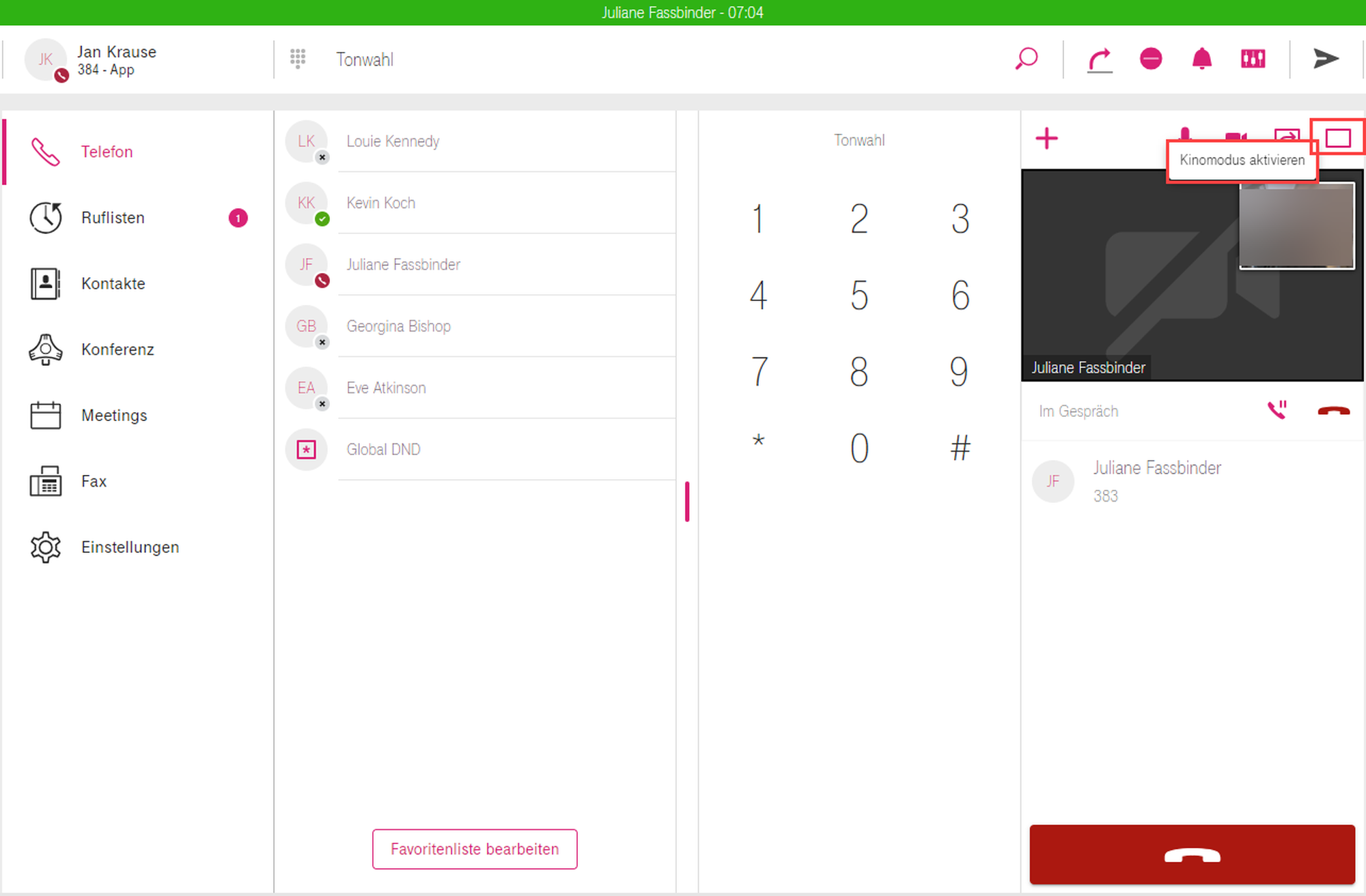 Ist das App-Menü eingeklappt, sehen Sie oben links Ihren Namen und das ausgewählte Endgerät, mit dem Sie telefonieren.