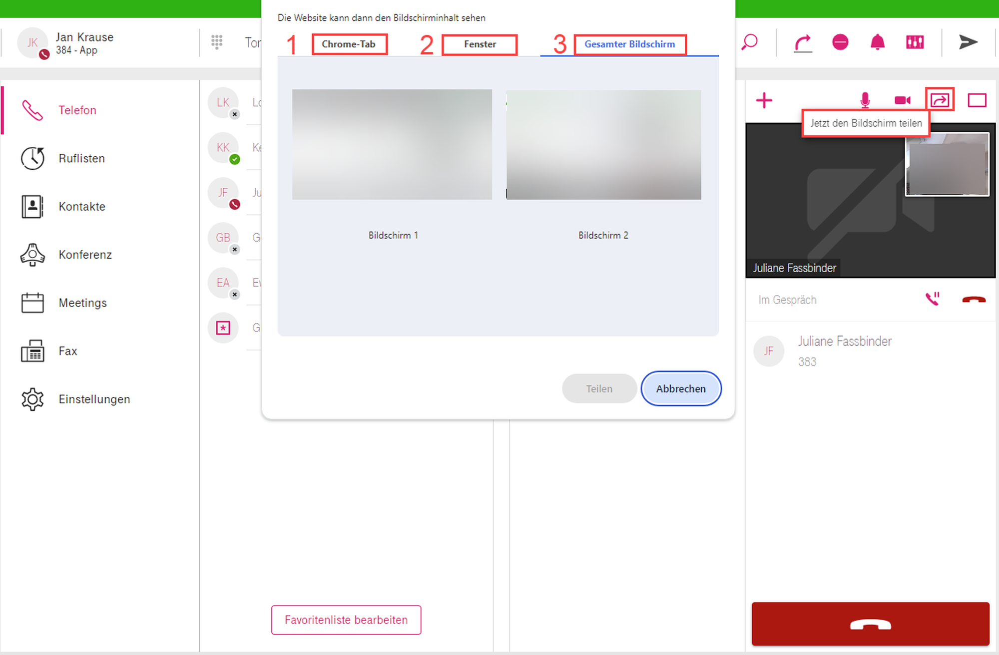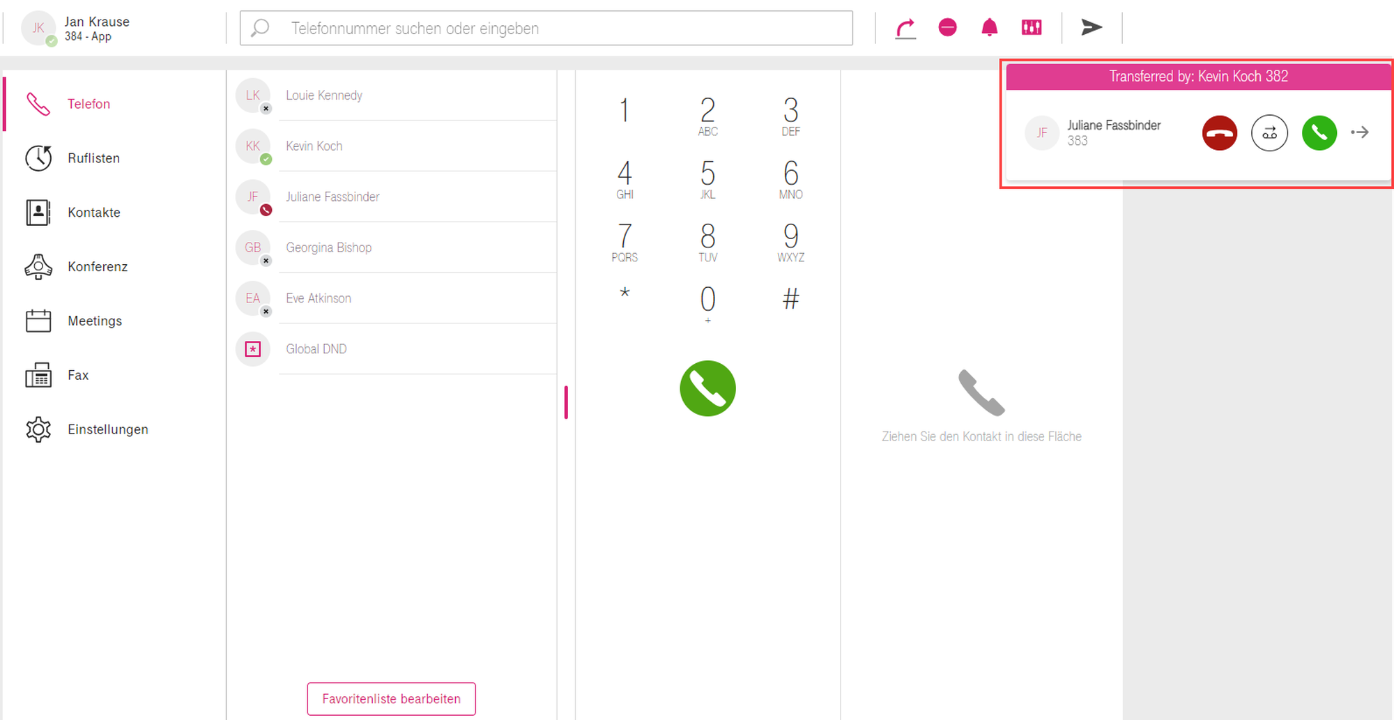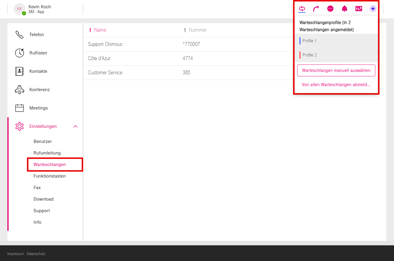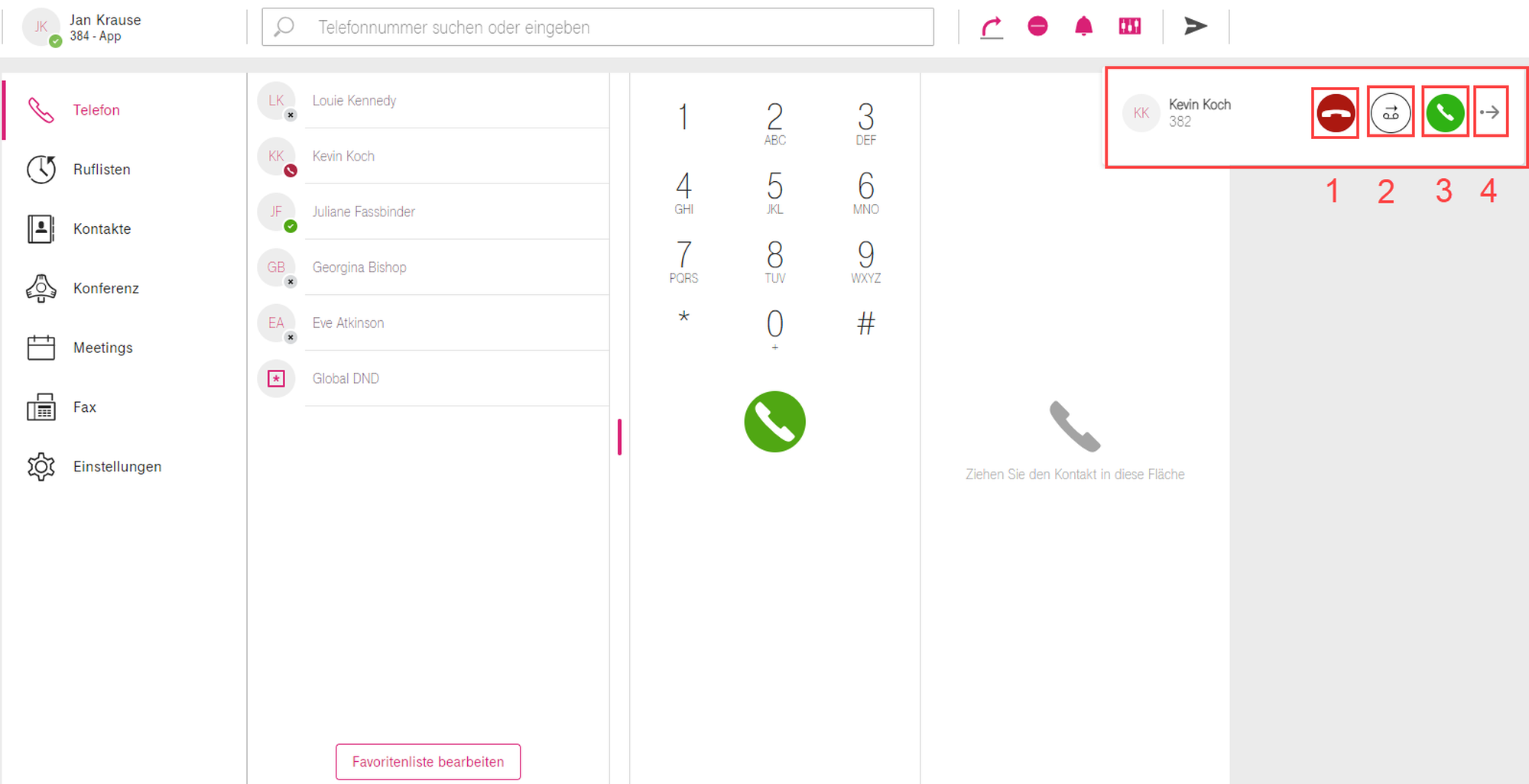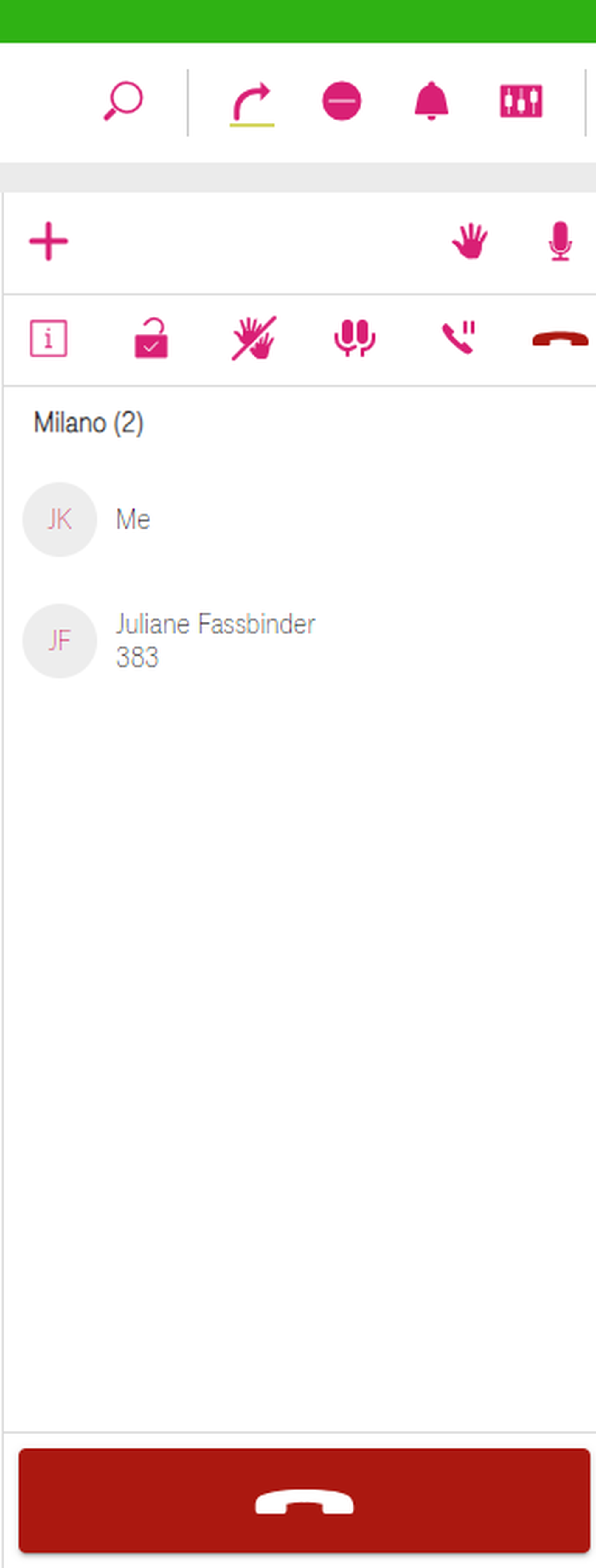 Ist das App-Menü eingeklappt, sehen Sie oben links Ihren Namen und das ausgewählte Endgerät, mit dem Sie telefonieren.
