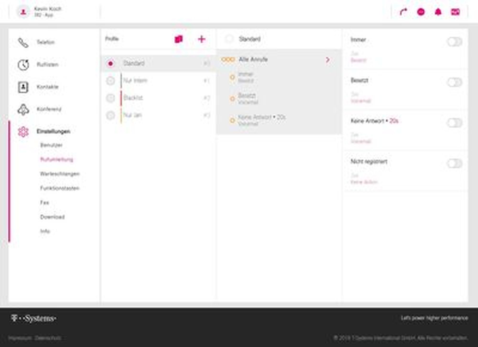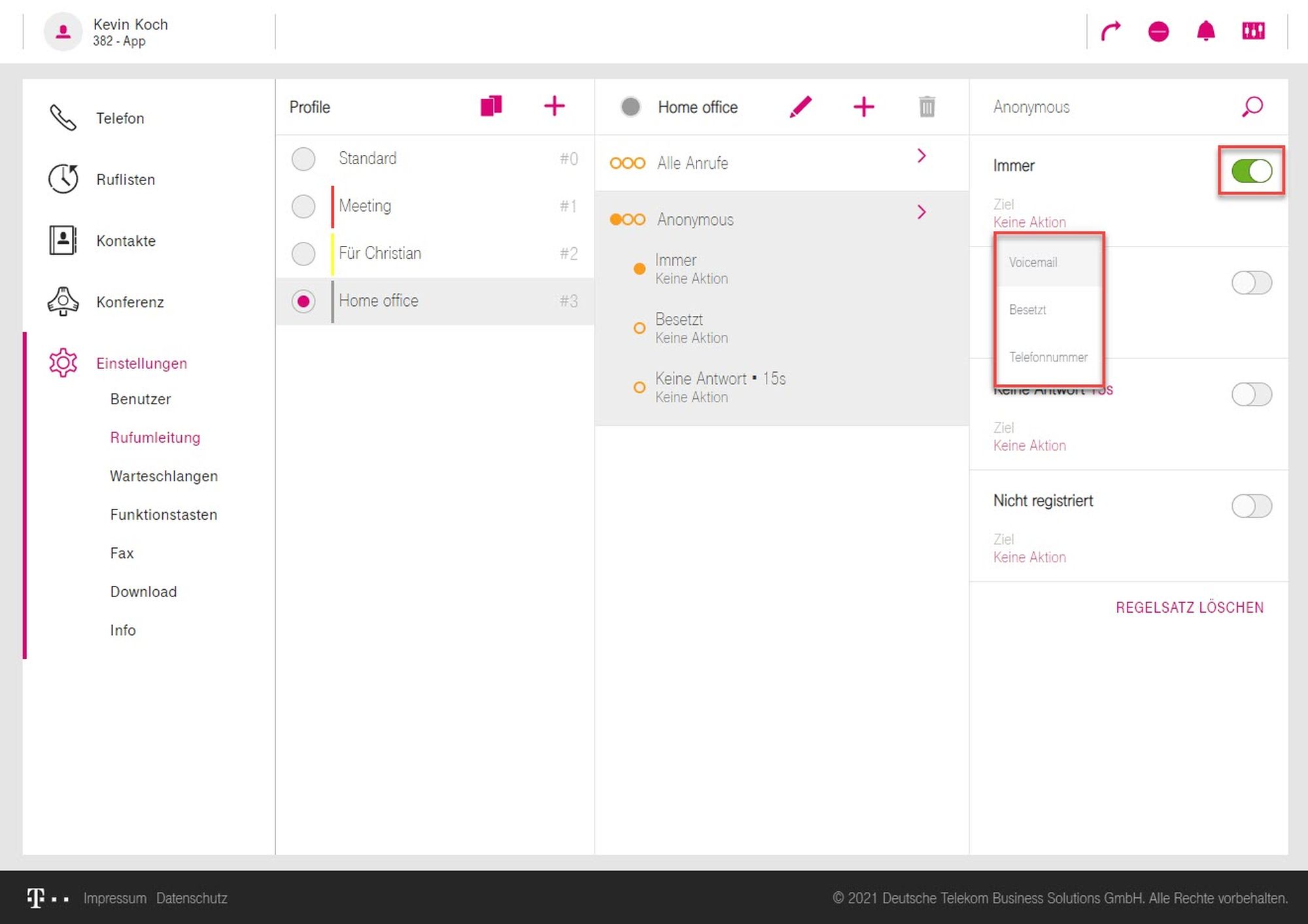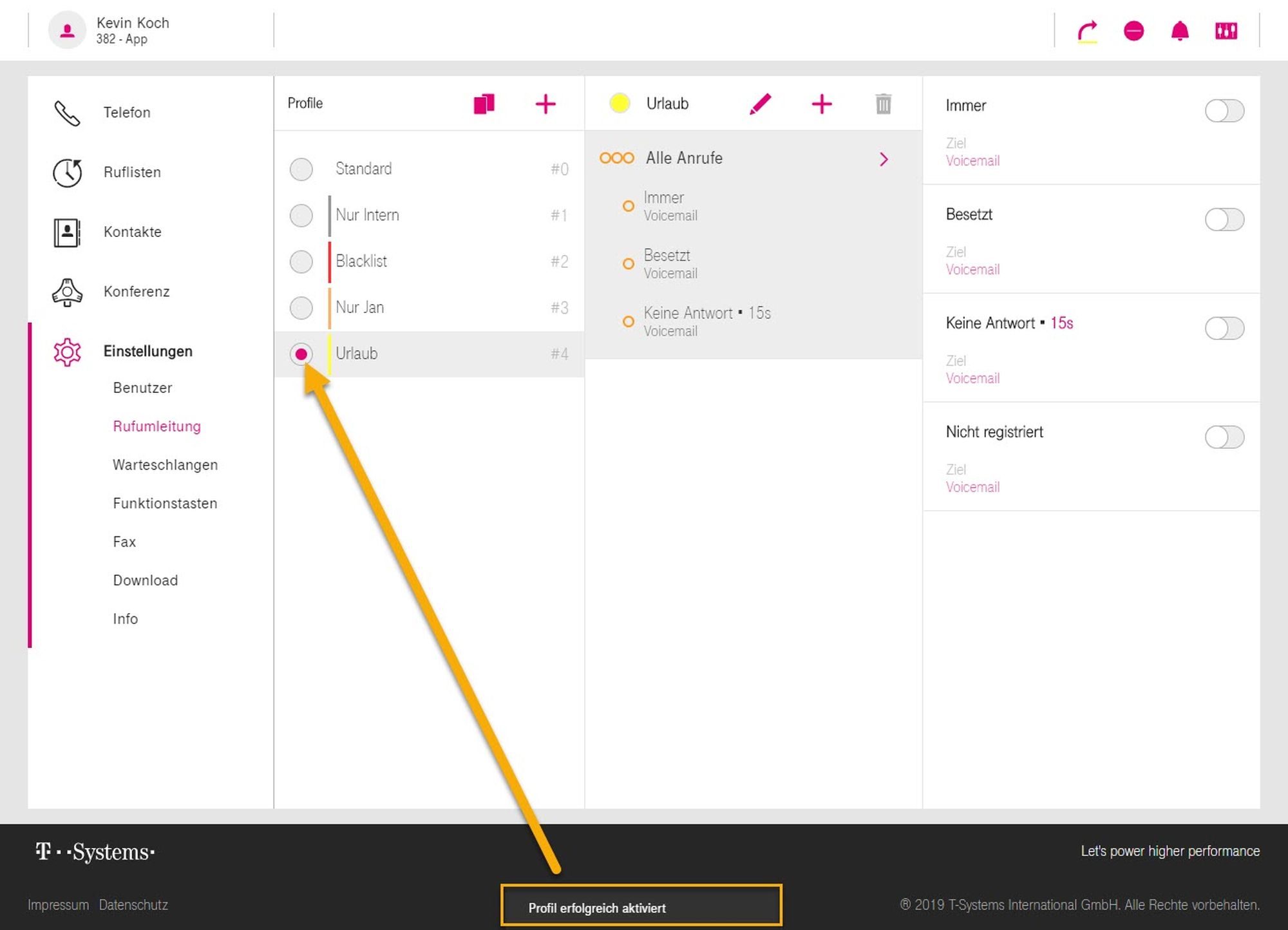 | Rufumleitung: Wählen Sie das Rufumleitungsprofil, das Sie aktivieren möchten. | |