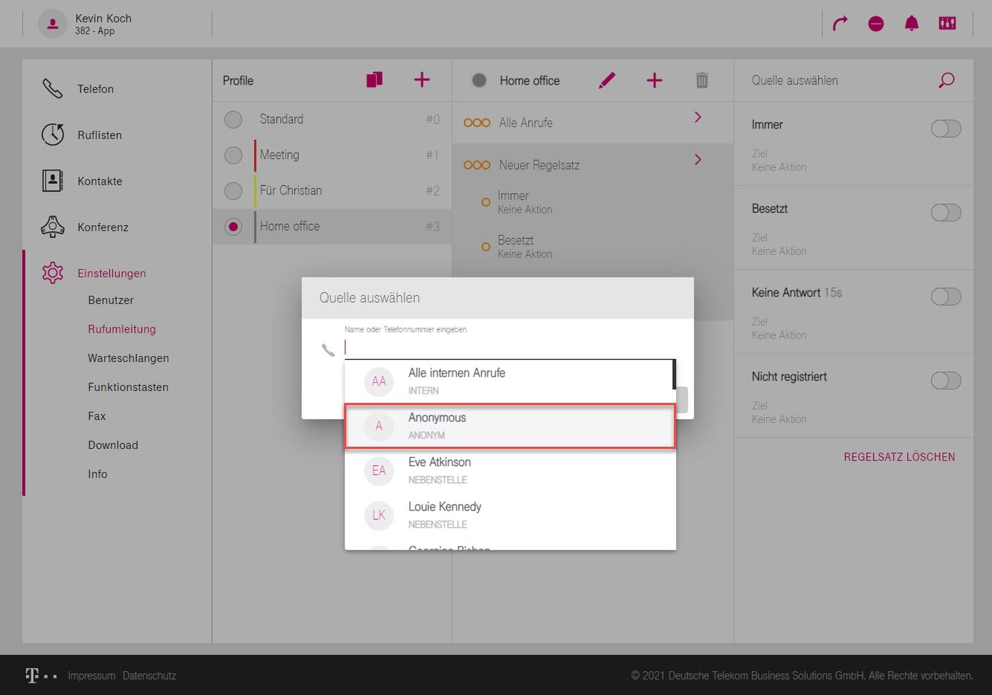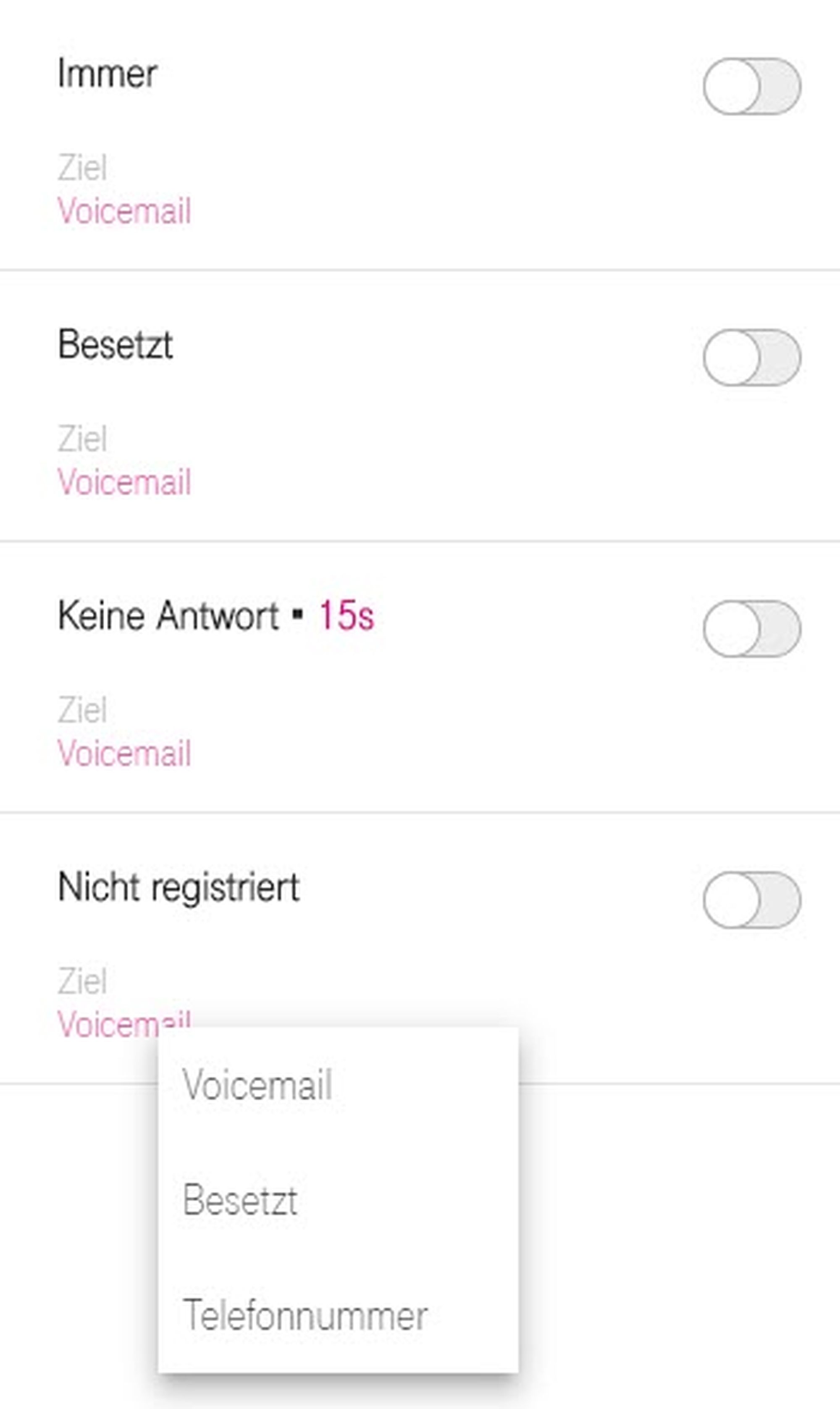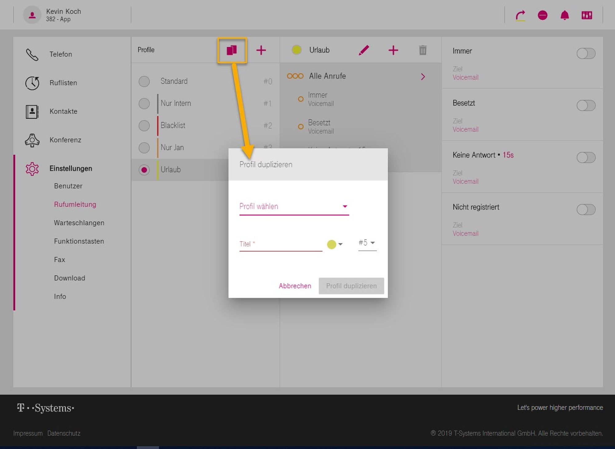 | Rufumleitung: Wählen Sie das Rufumleitungsprofil, das Sie aktivieren möchten. | |