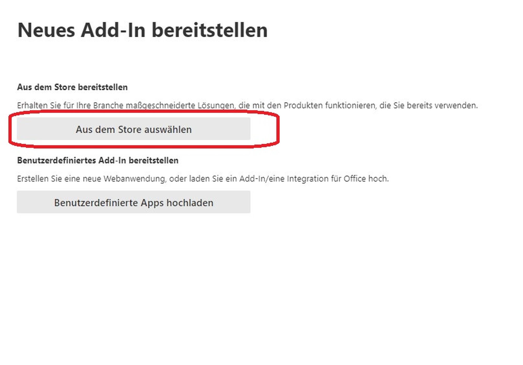 4. Im Fenster „Neus Add-in bereitstellen" auf Weiter und anschließend auf Aus dem Store auswählen klicken_._