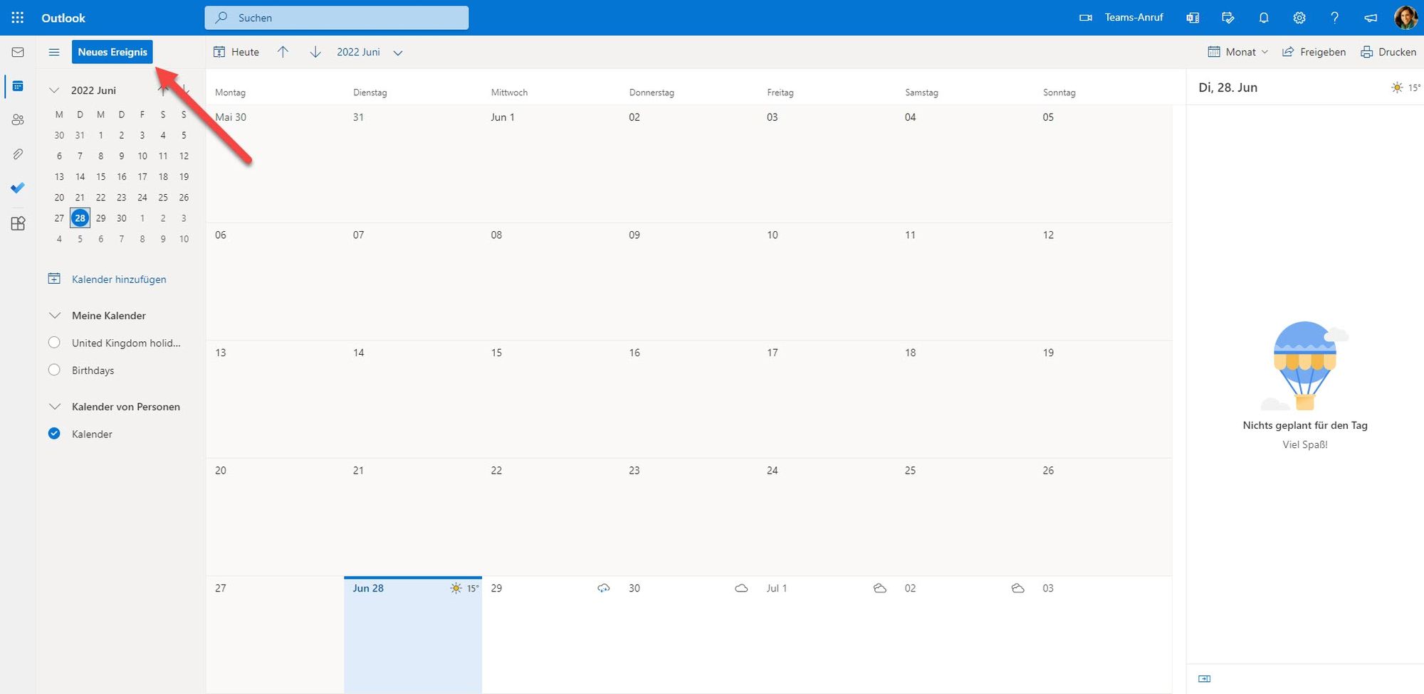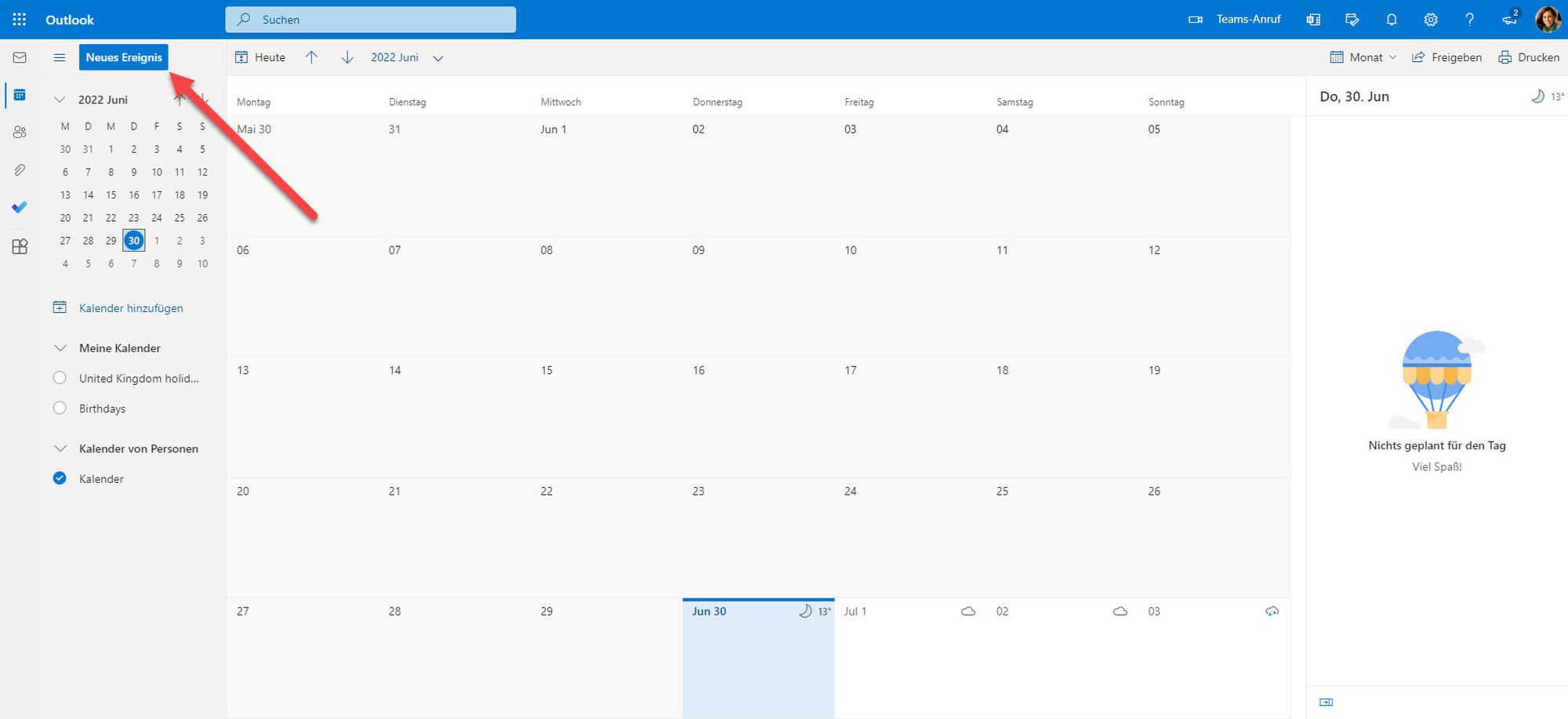 2. Klicken Sie auf Ihren Kalender und erstellen Sie ein neues Ereignis.