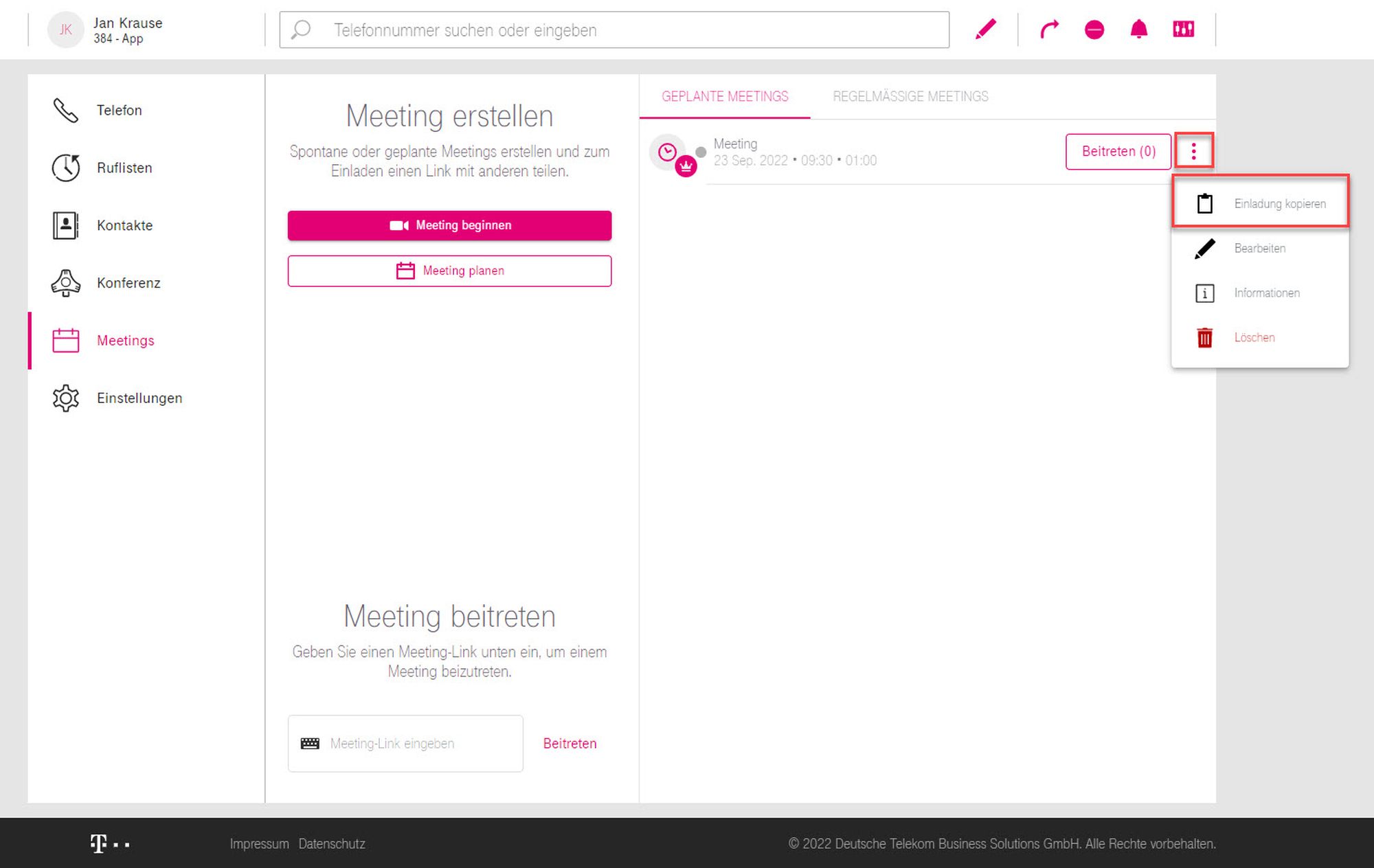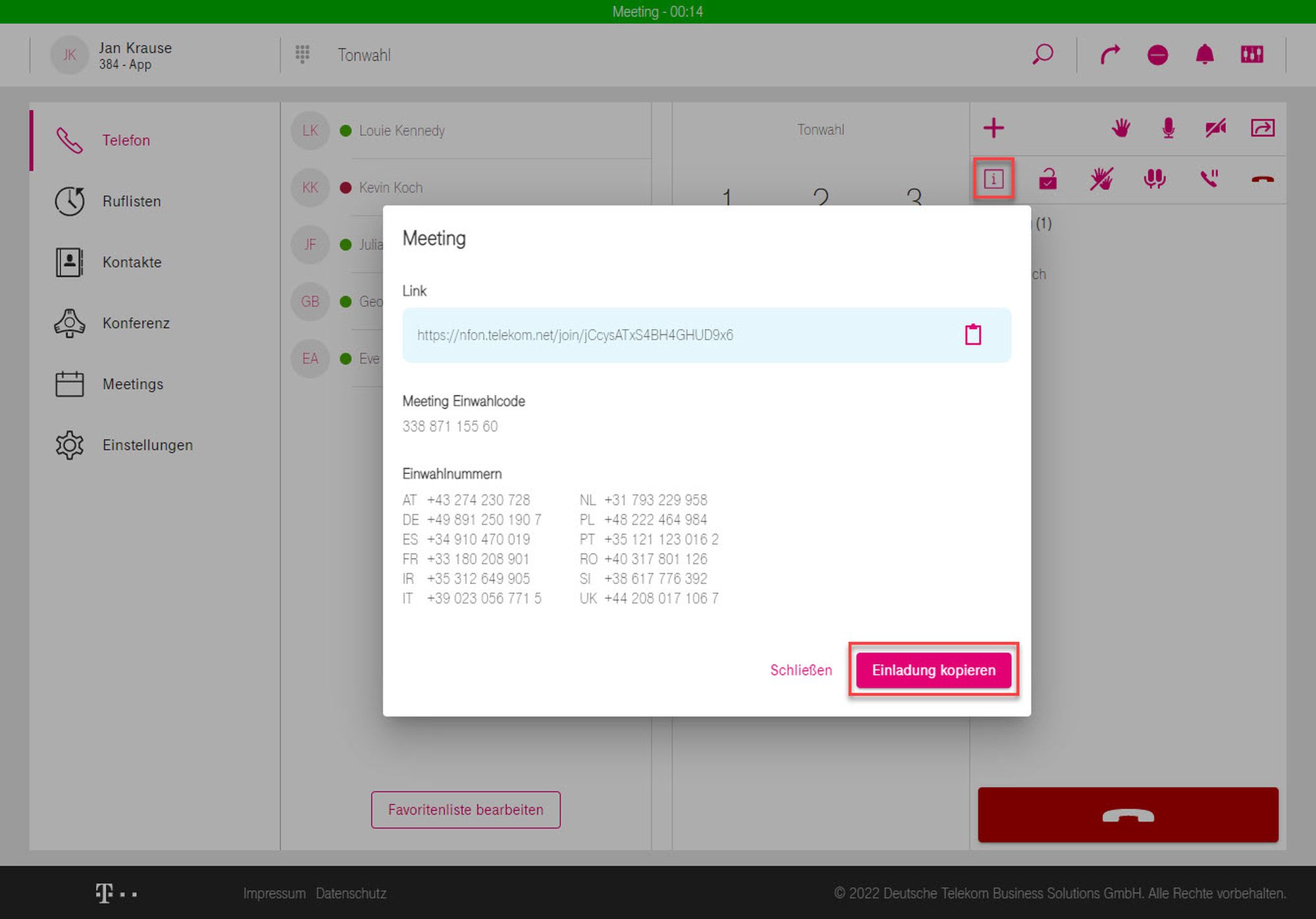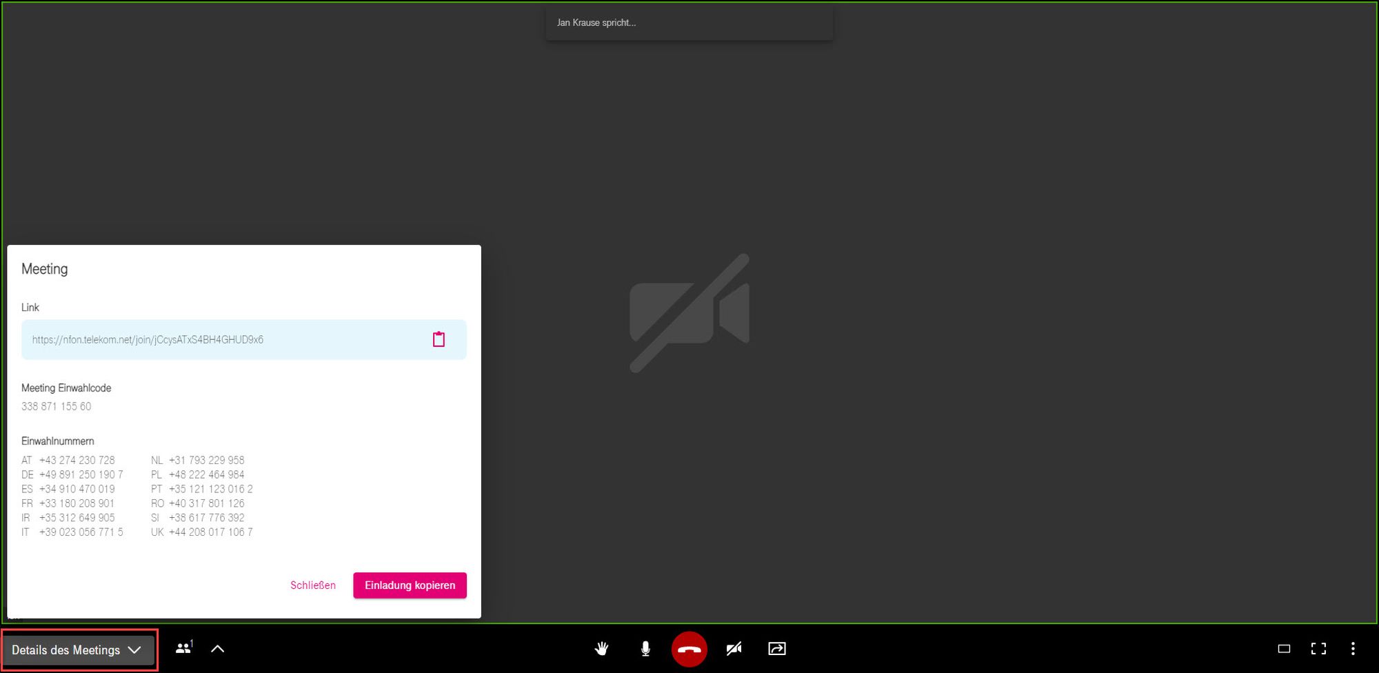 Klicken Sie Einladung kopieren (Unter Informationen sehen Sie neben dem Meeting Link auch den Meeting Einwahlcode sowie die Einwahlnummern)