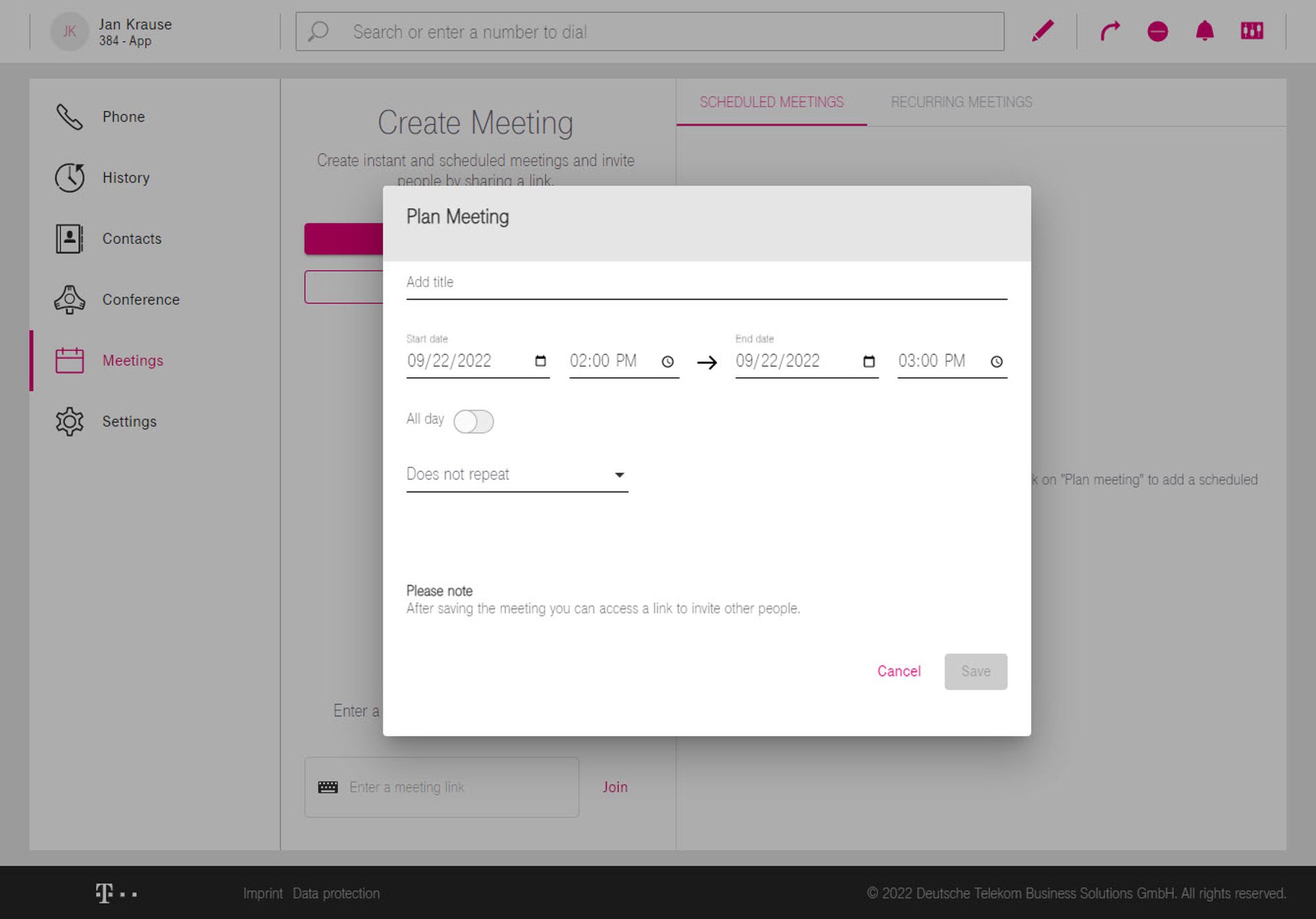 5. Sie haben Ihr NFON X powered by Telekom-Meeting erfolgreich erstellt. Die URL für Ihr NFON X powered by Telekom-Meeting finden Sie auch in der Termininformation in der Kalenderübersicht.