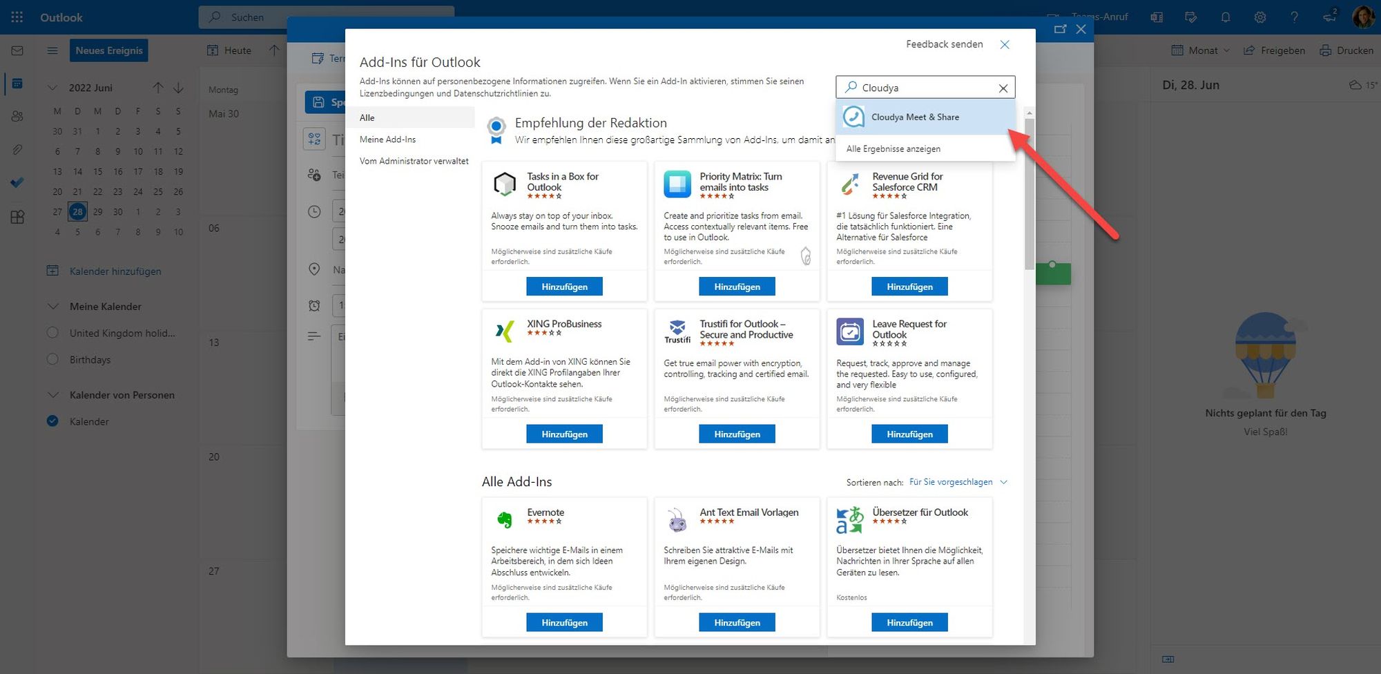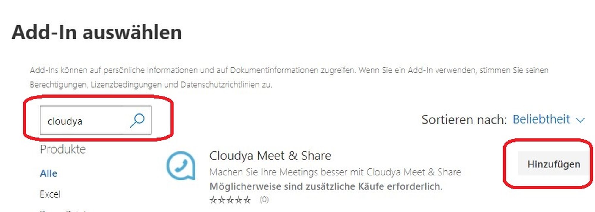 2. Suchen Sie nach NFON X powered by Telekom. Wählen Sie das Add-in NFON X powered by Telekom Meet & Share.