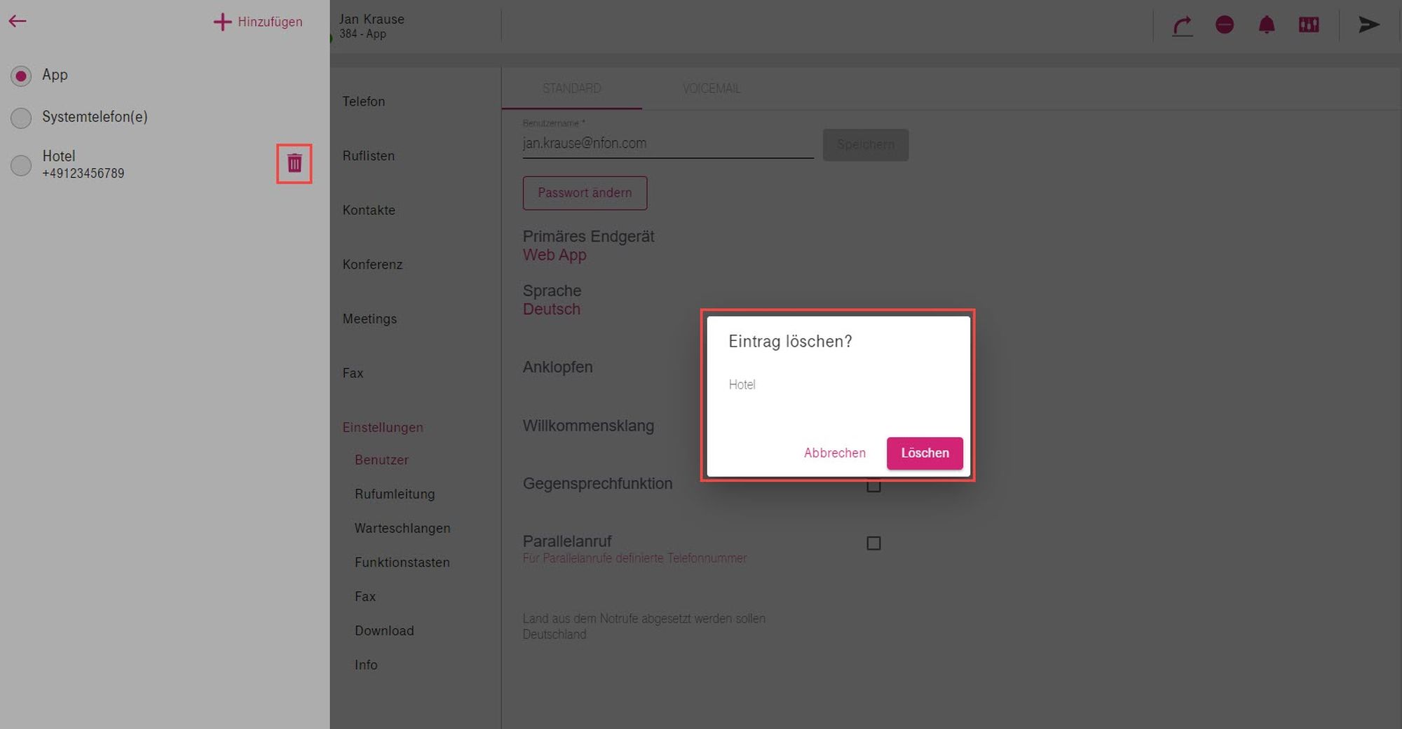 ⇒Es öffnet sich ein Dialogfenster.Klicken Sie auf Löschen, um den Eintrag zu löschen oder auf Abbrechen, um den Eintrag zu behalten.