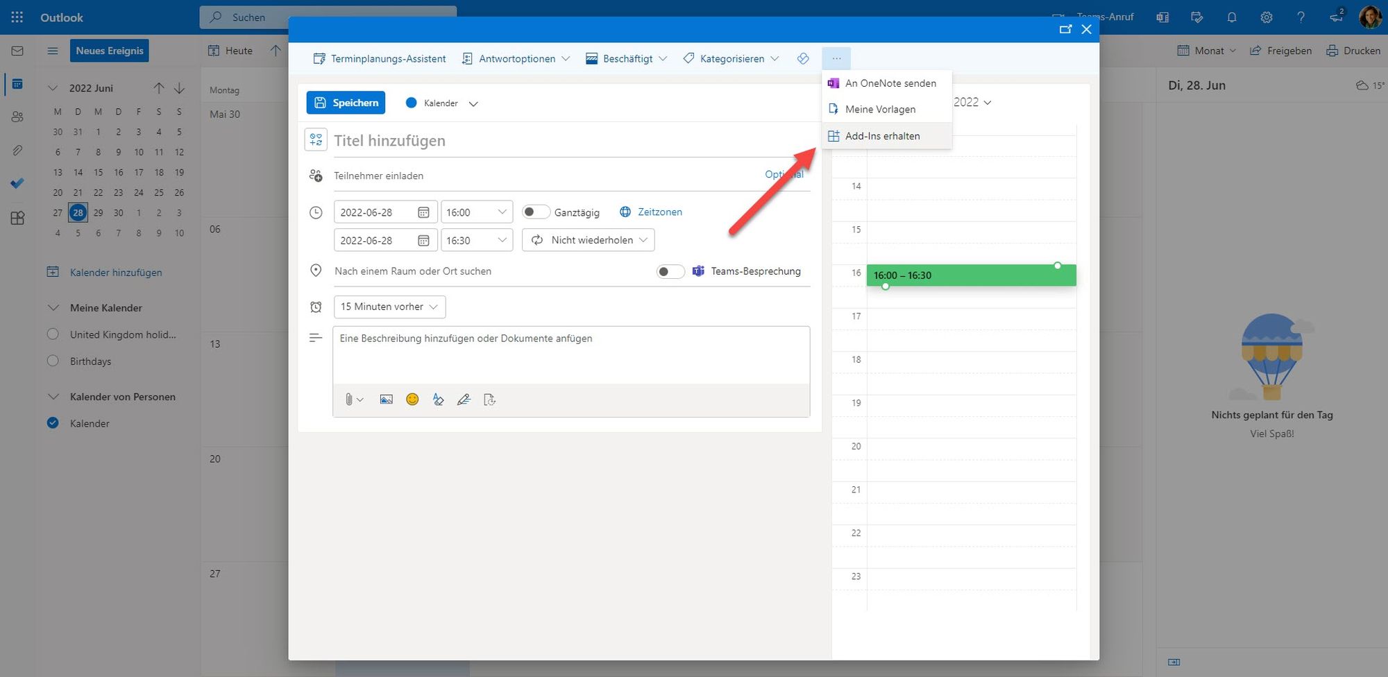 3. Gehen Sie zum Optionsmenü (...) in der oberen rechten Ecke. Öffnen Sie es und klicken Sie Add-ins erhalten.