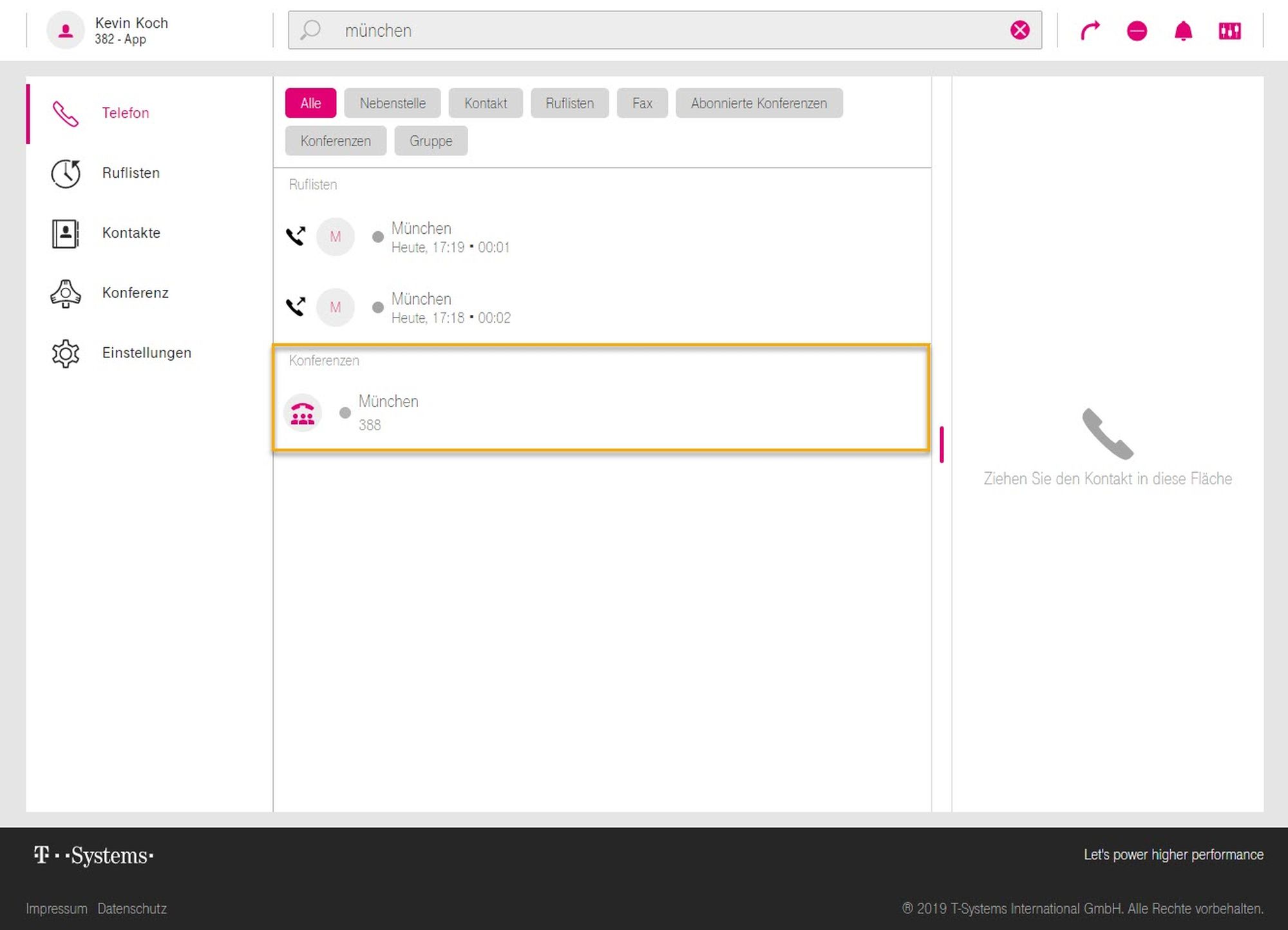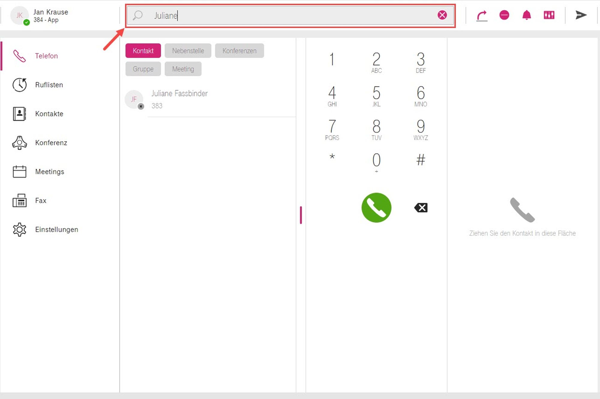 Über die Suchleiste können Sie Kontakte, Nebenstellen, Konferenzen, Meetings und Gruppen durchsuchen. Die Suchergebnisse werden nach diesen Kategorien geclustered dargestellt.