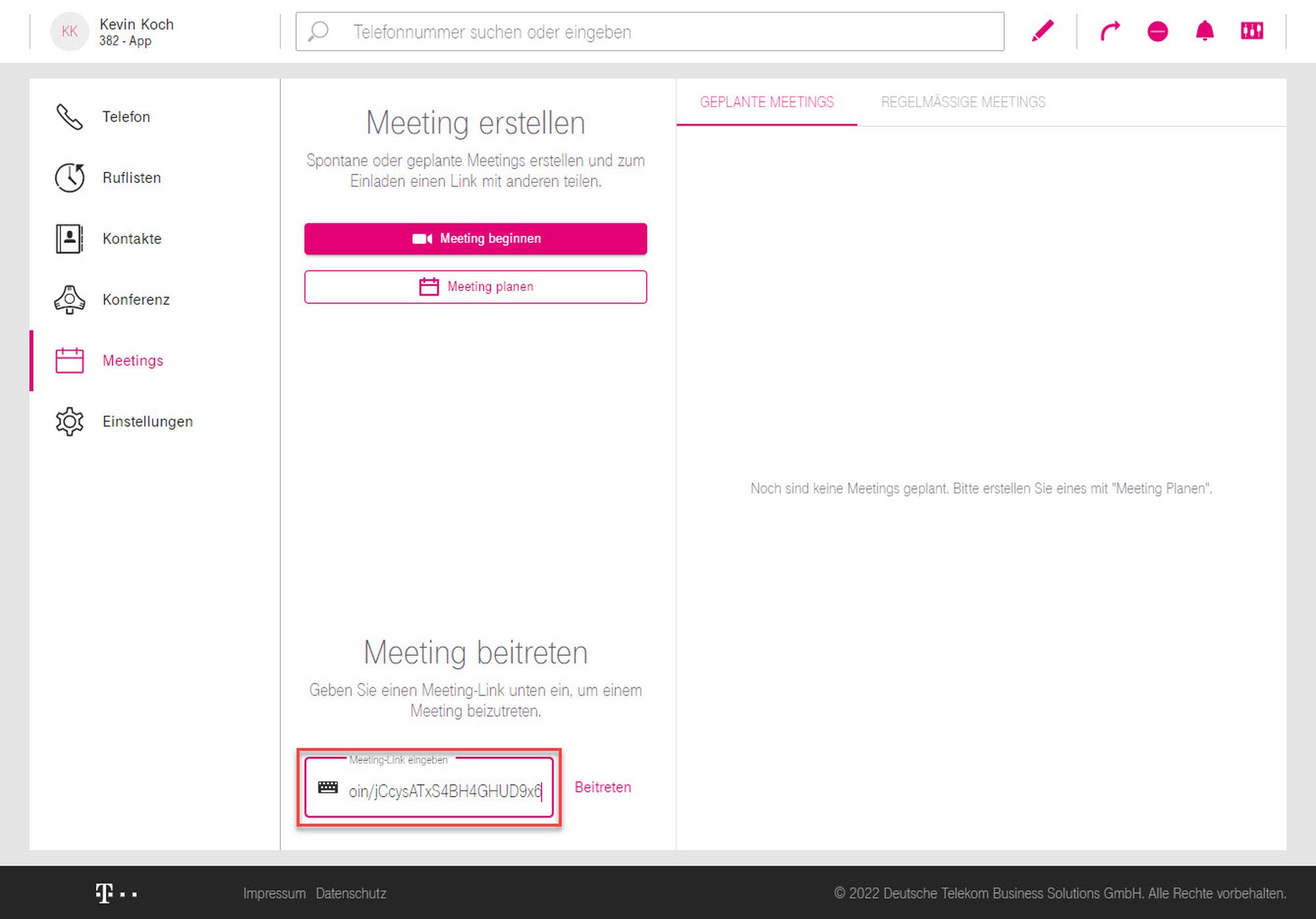 Fügen Sie den Link zum Meeting in das Eingabefeld unter Meeting beitreten ein und klicken Sie auf beitreten.