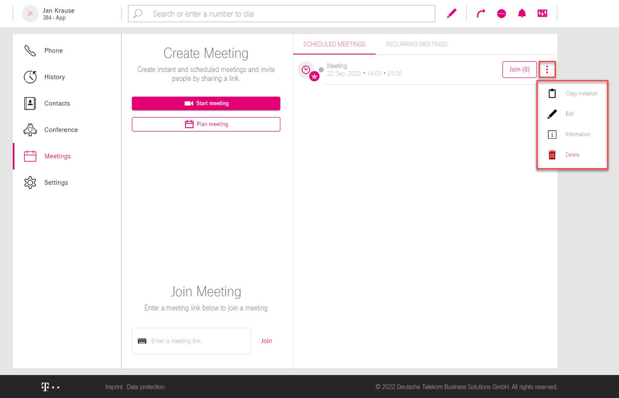 2. Öffnen Sie das Optionsmenü in der oberen rechten Ecke. Wählen Sie die Option NFON X powered by Telekom Meet&Share und klicken Sie auf Meeting hinzufügen.