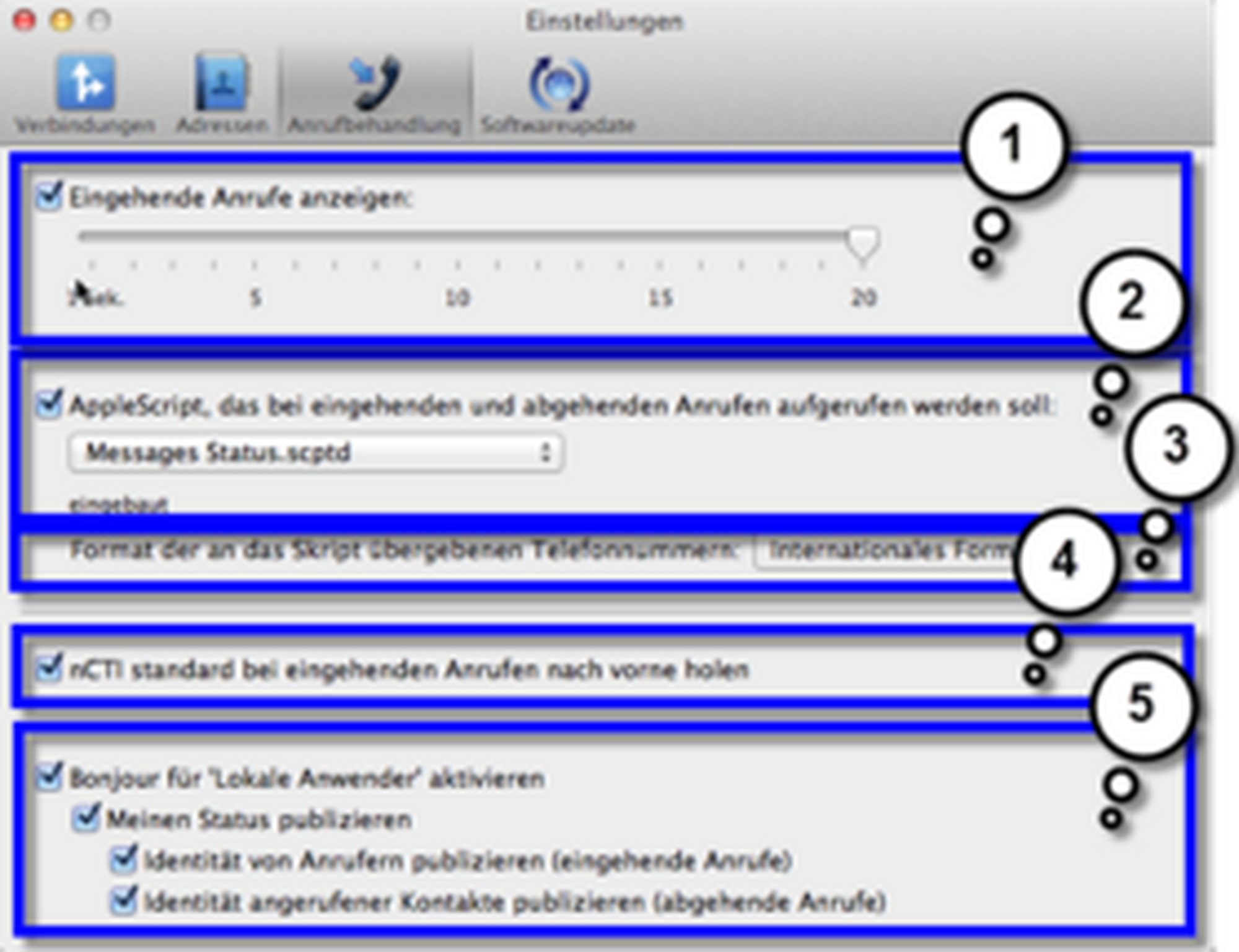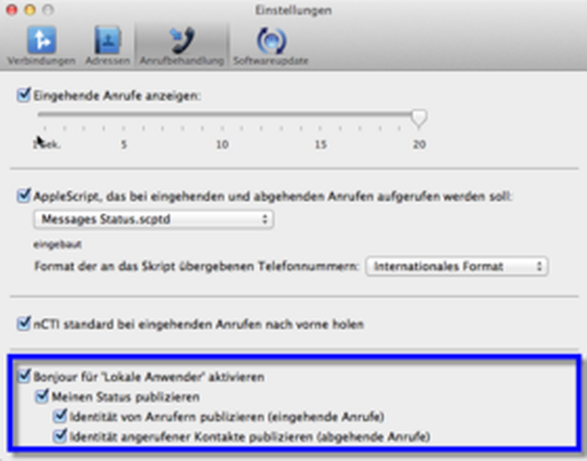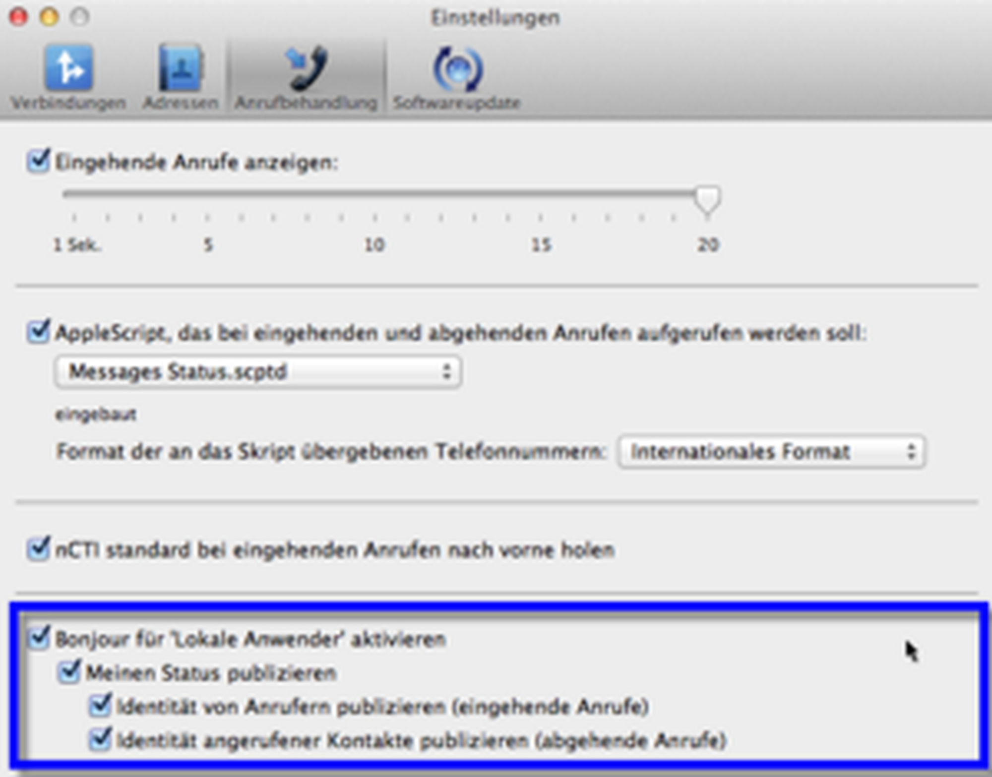Ihr NCTI standard Client für Mac verfügt über zahlreiche Funktionen wie bpsw. Click-2-Dial. Außerdem ist mithilfe einer intelligenten Wahlwiederholungsliste auch das direkte Anwählen von Kontakten verschiedener Adressbücher möglich. Damit zeigt Ihnen der NCTI standard Client für Mac sogar Name, Firma und Profilbild eines Anrufers mittels Screenpopup an. Ergänzend dazu ist eine weitere Besonderheit Ihres Clients die Anzeige des Presence-Status mithilfe der Bonjour-Funktion. Somit haben Sie jederzeit einen Überblick der Rufaktivitäten aller Anwender im gleichen Netz.