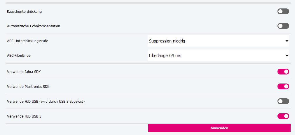 AEC-Filterlänge | Deaktiviert die automatische AEC-Stream-Verzögerung Stattdessen wird die unter „Standard für AEC-Stream-Verzögerung” angegebene Verzögerung verwendet. |