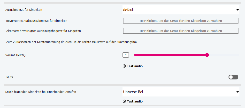 Alternativ bevorzugtes Ausgabegerät für Klingelton | Alternative Audioausgabe für die Wiedergabe von Klingeltönen, wenn das bevorzugte Gerät nicht verfügbar ist. |