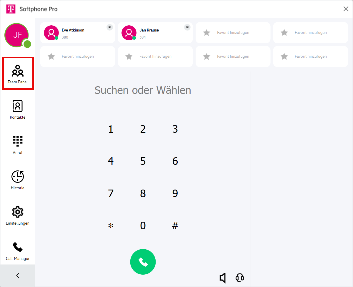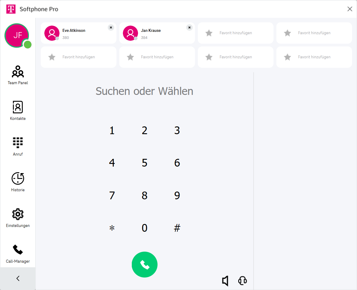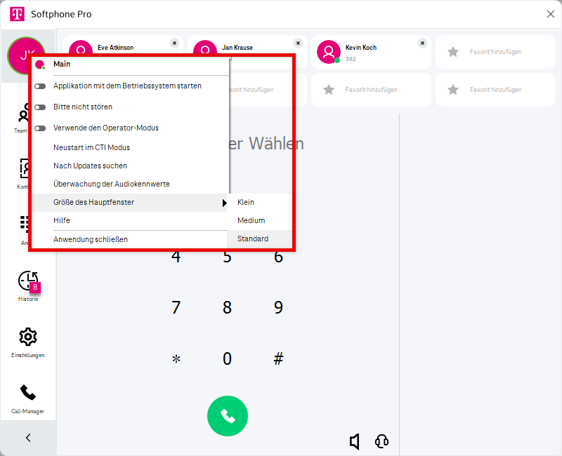 Hinweis: Das Ändern der Fenstergröße startet den Softphone Pro Client neu.Hilfe öffnen (Das Softphone Pro-Handbuch wird im Webbrowser geöffnet.)