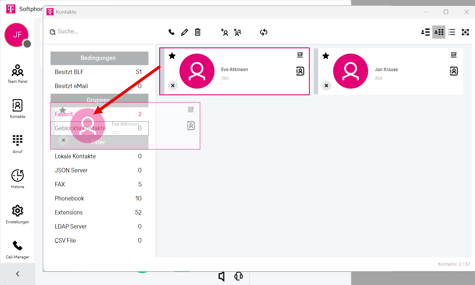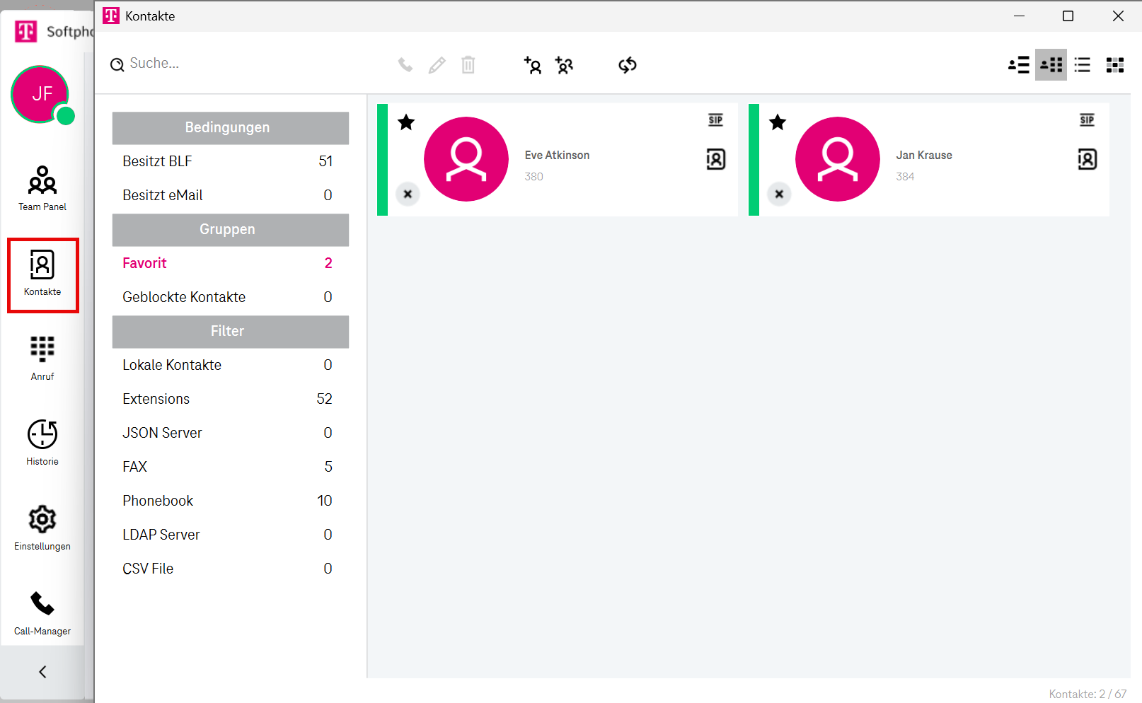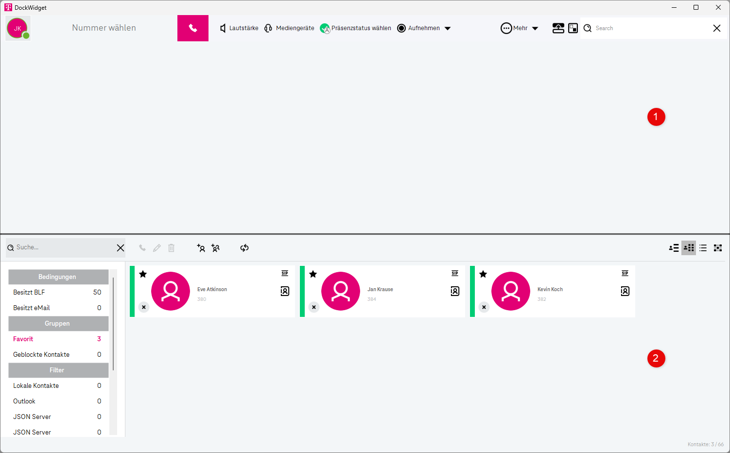 Am oberen Rand des Bildschirms wird eine Informationsleiste angezeigt, die sowohl Kontakte als auch Kontaktgruppen anzeigt.Kontakte