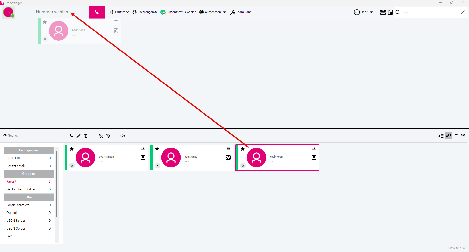 ⇒ Die passenden Ergebnisse werden im Favoritenbereich angezeigt.Klicken Sie auf den gewünschten Kontakt, um die Kontaktinformationen zu öffnen.
