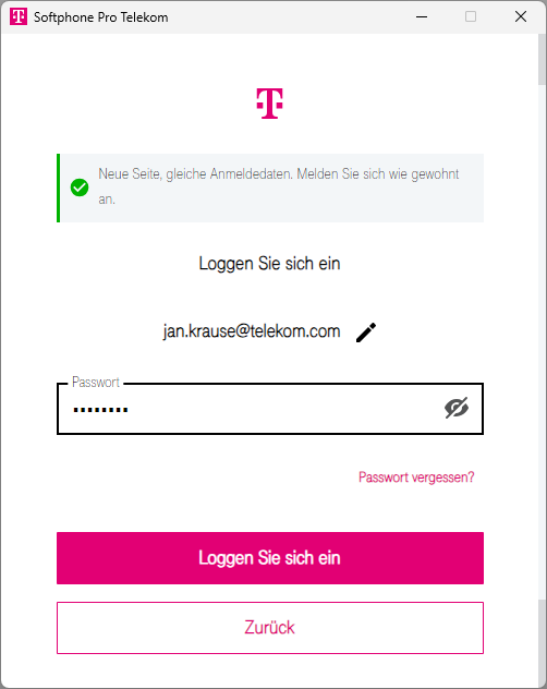 ⇒ Es öffnet sich ein Anmeldefenster.Geben Sie Ihre NFON X Powered by Telekom-E-Mail-Adresse und Ihr Passwort ein.