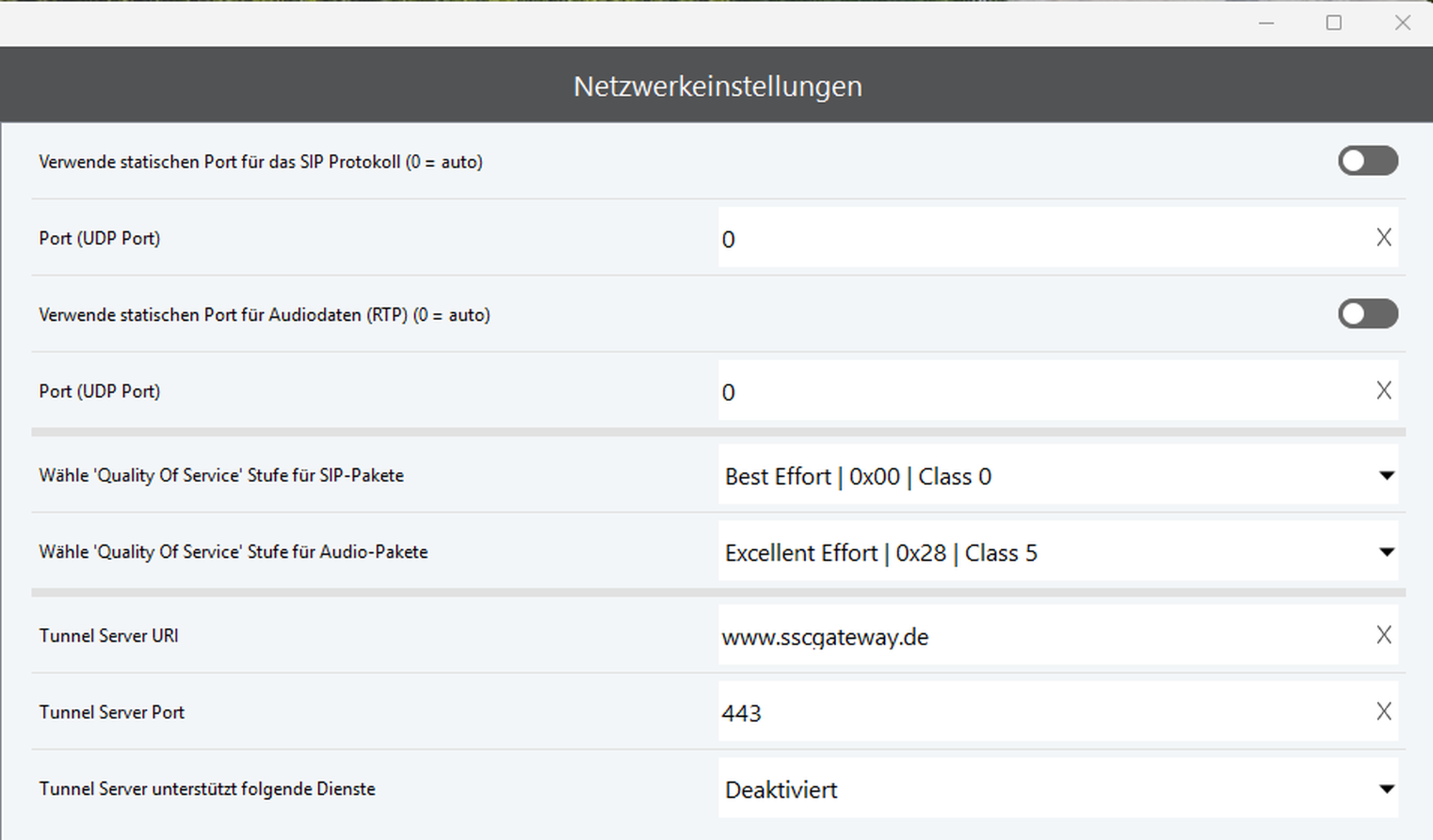 Statischen Port für Audiodaten (RTP) verwenden (0 = auto) | Beachten Sie die Firewall-Einstellungen. |