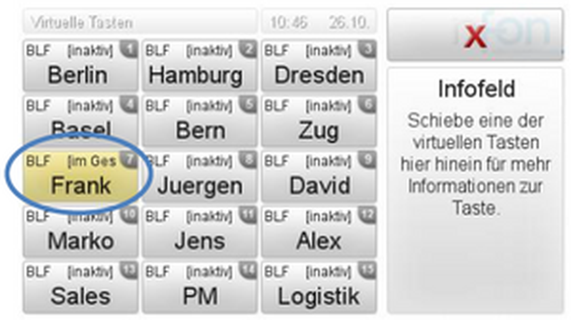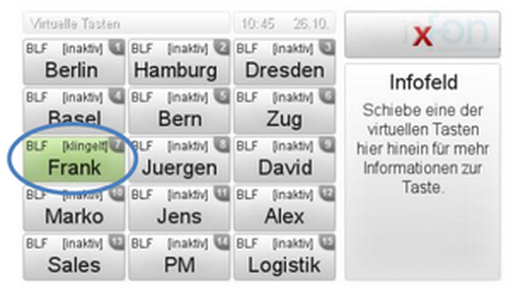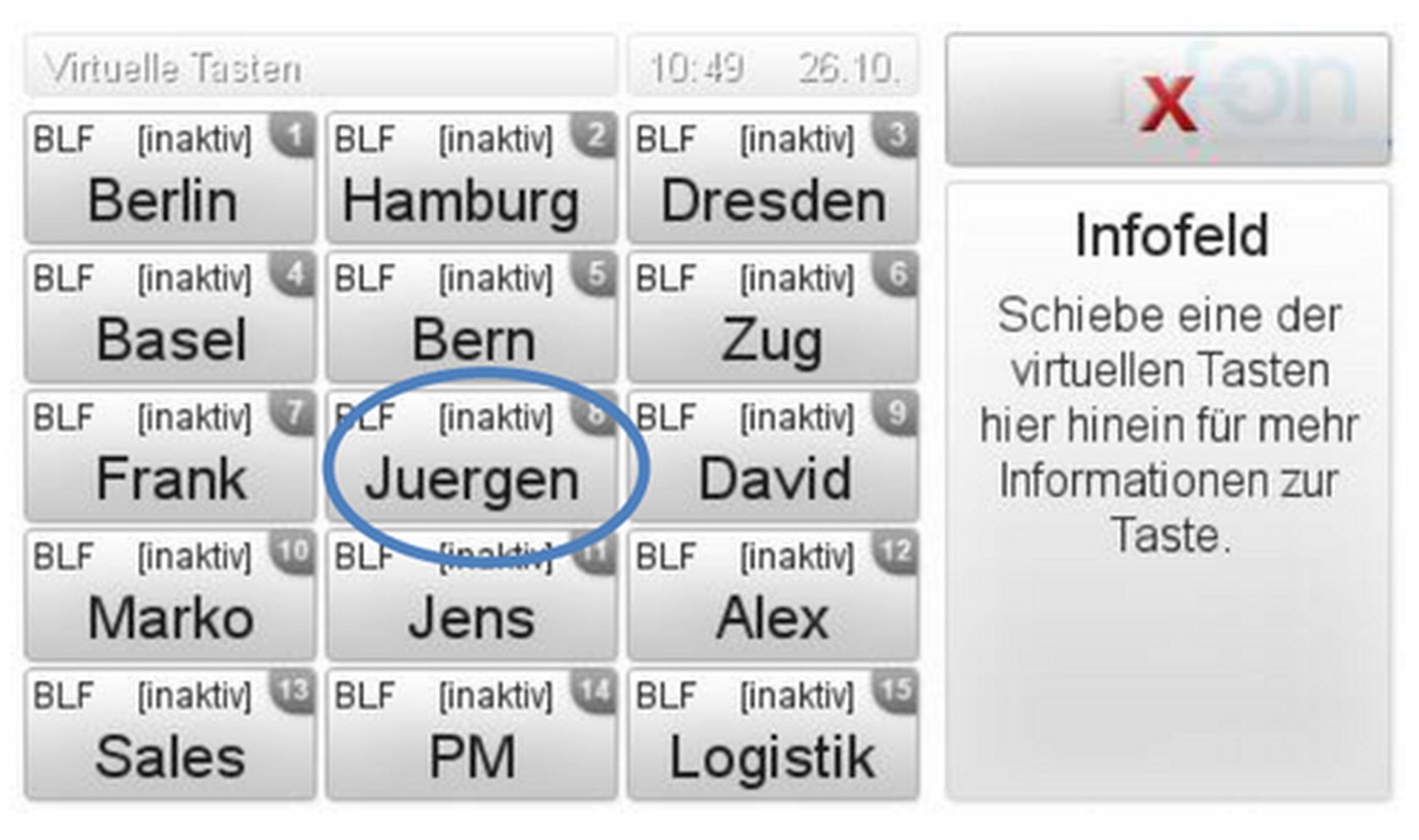 um die „virtuellen Tasten“ anzuzeigen.Wenn Sie nun z.B. Juergen anrufen möchten, drücken Sie einfach auf die „virtuelle Taste“. Die Verbindung wird nun aufgebaut. Sie können diese Funktionstasten auf nControl konfigurieren.