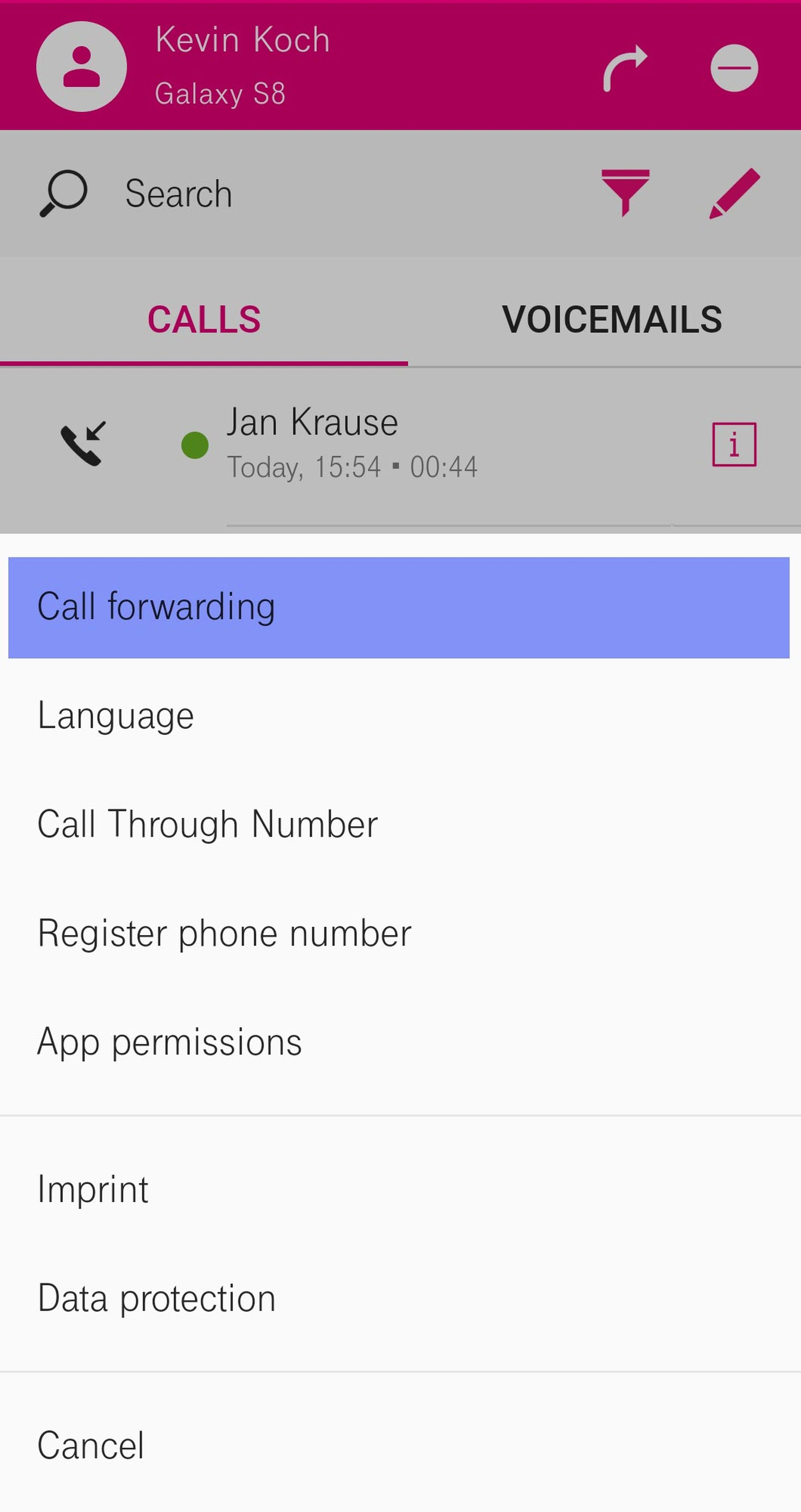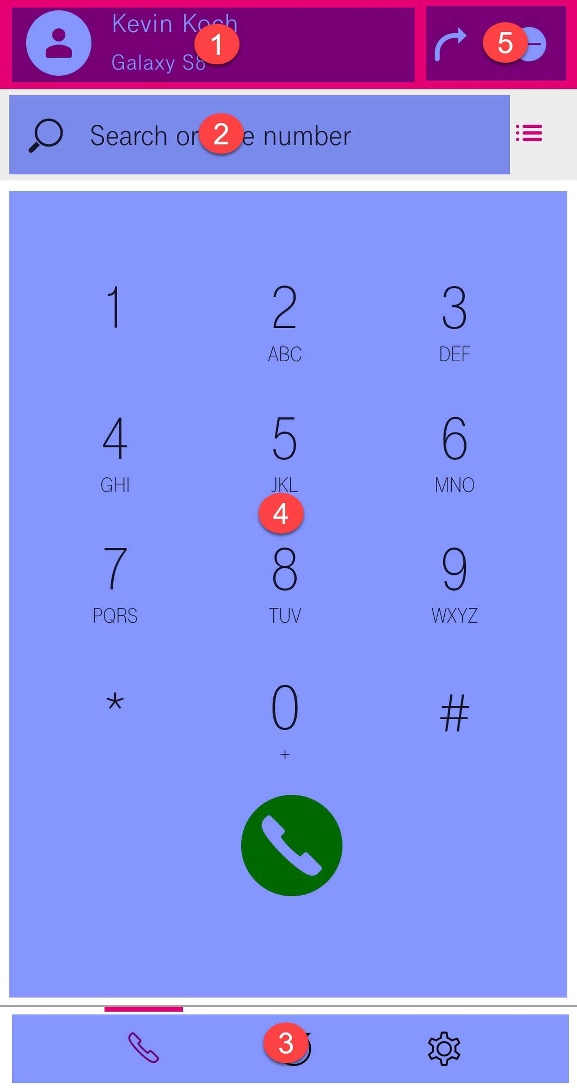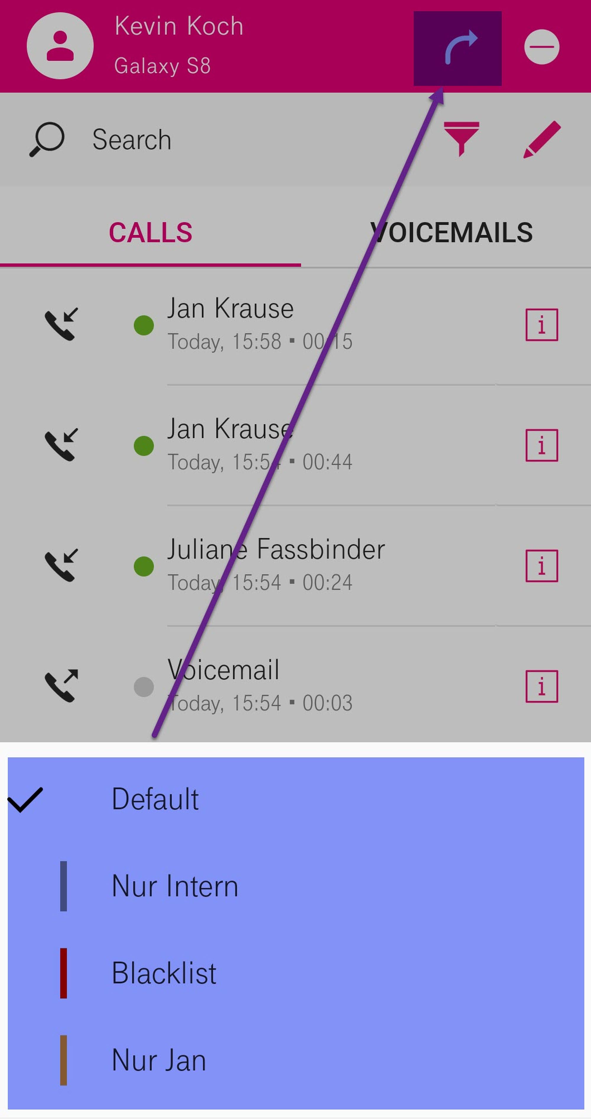 Here you can activate and deactivate your call forwarding profiles. If you have created your own call forwarding profiles via the Web App or the Desktop App, they will appear on the start screen of the Mobile App under the arrow button.