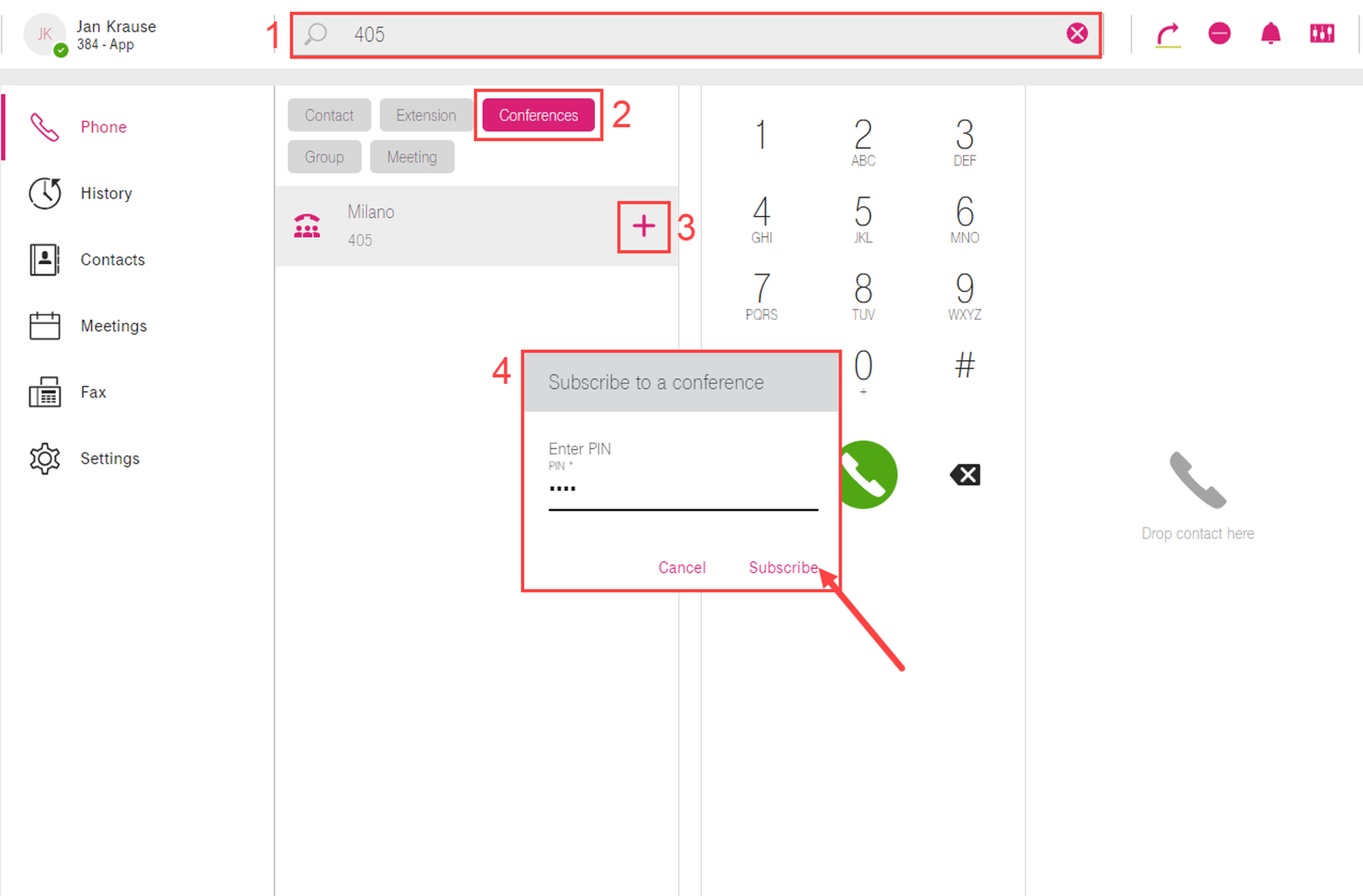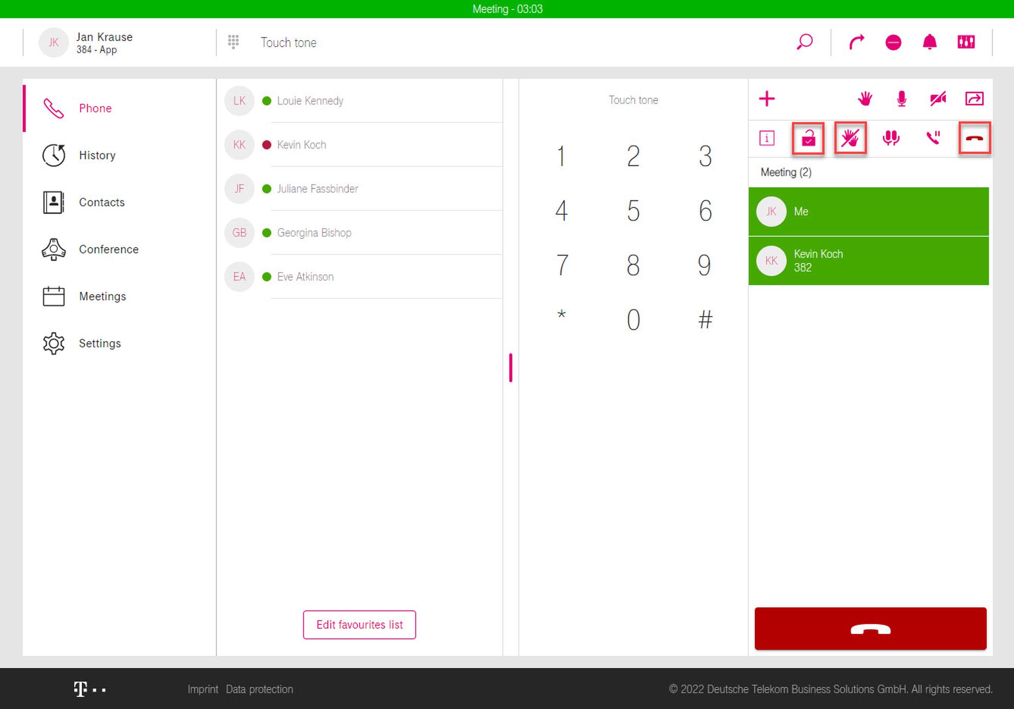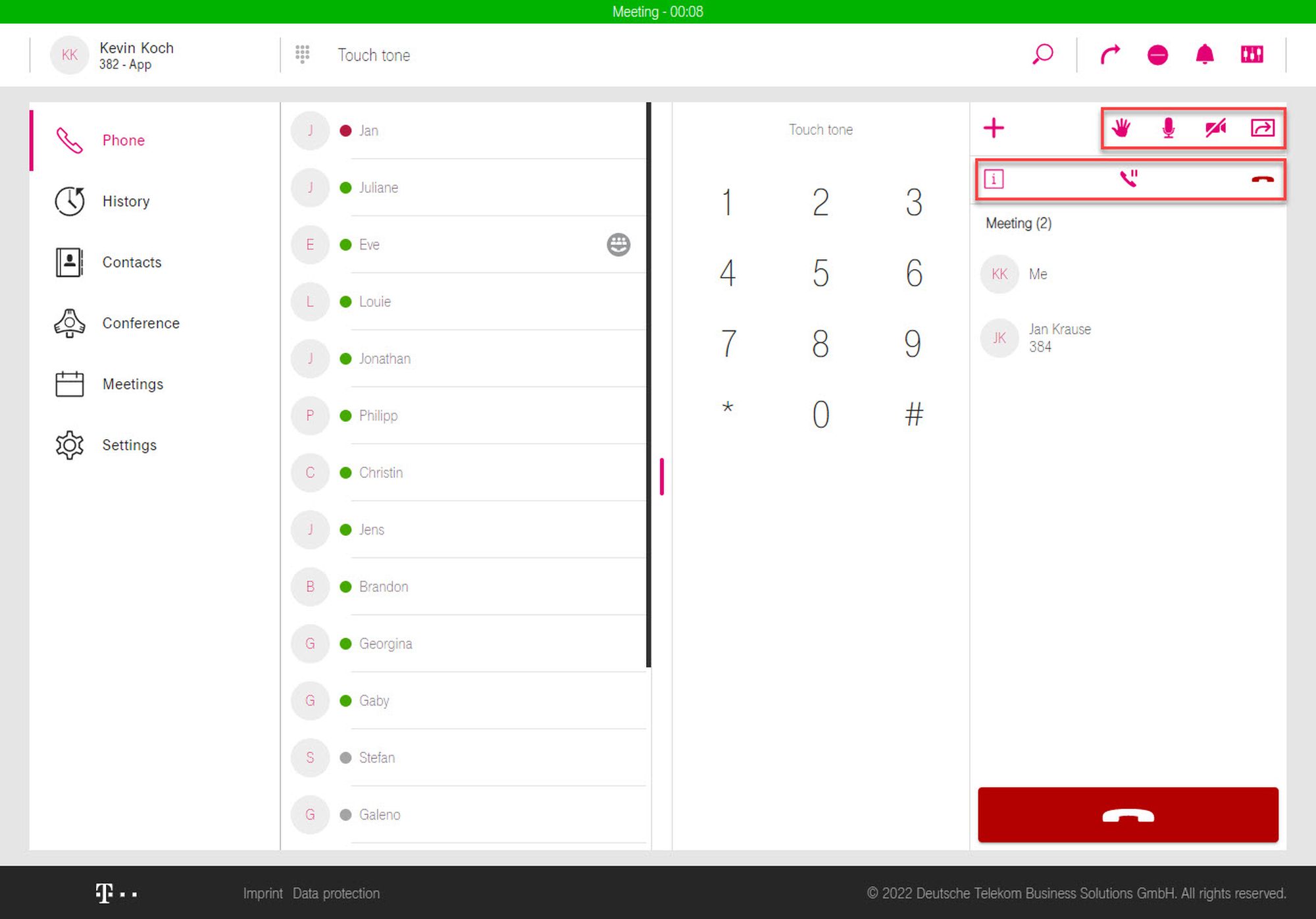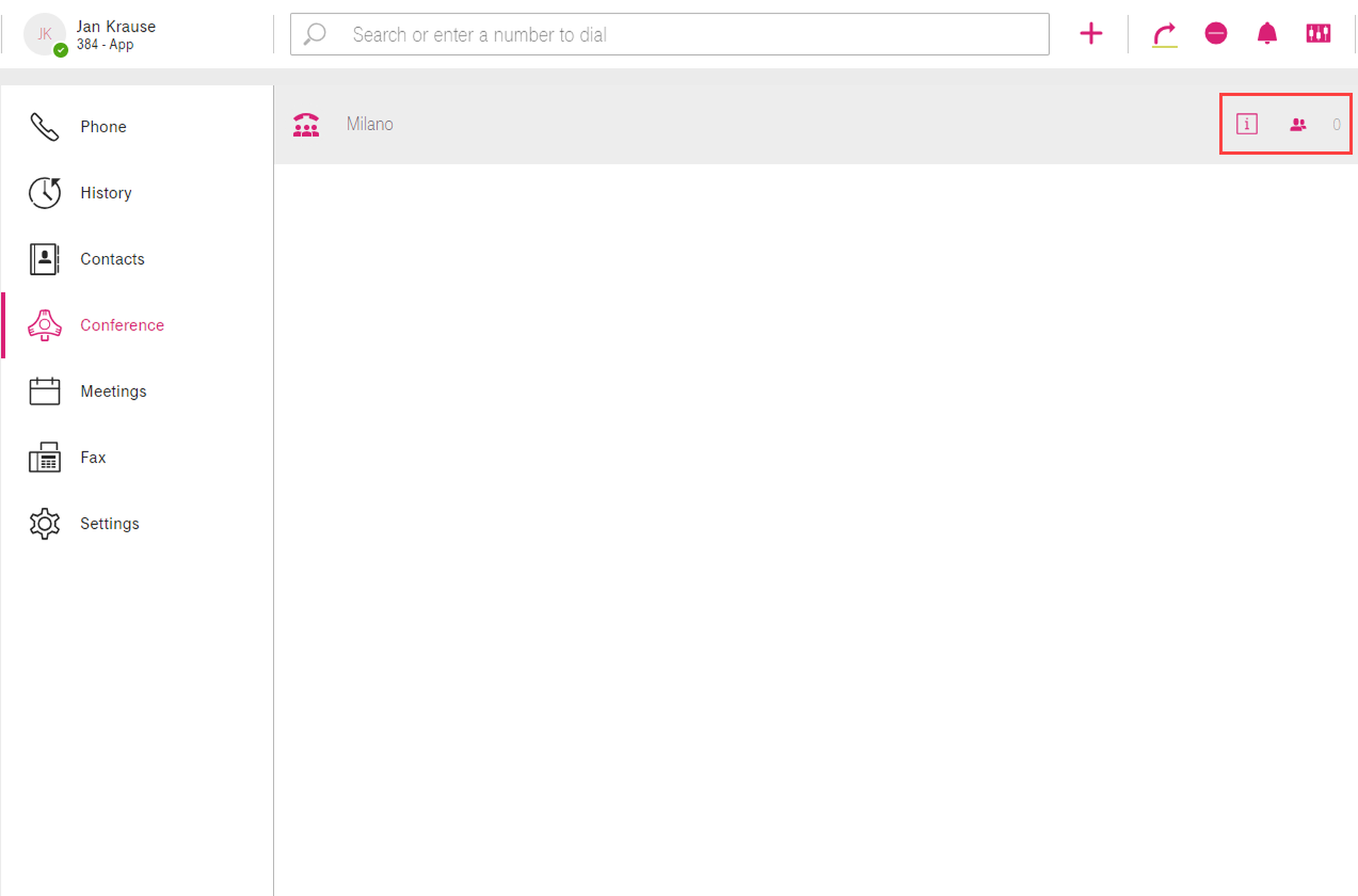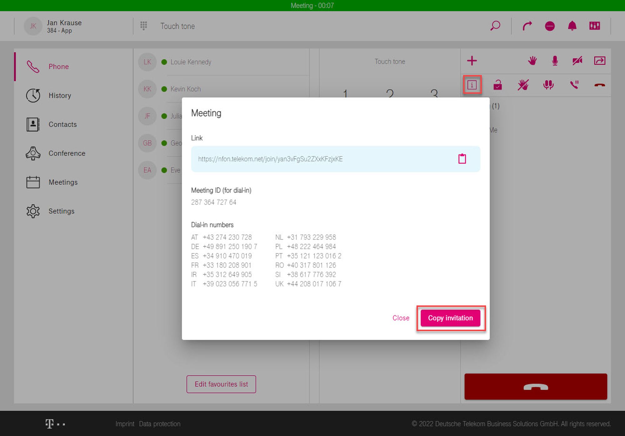 This is done by entering an optional participant ID when dialing in. The participant ID is displayed in the NFON X powered by Telekom App Suite Client on the first device in the meeting information.
