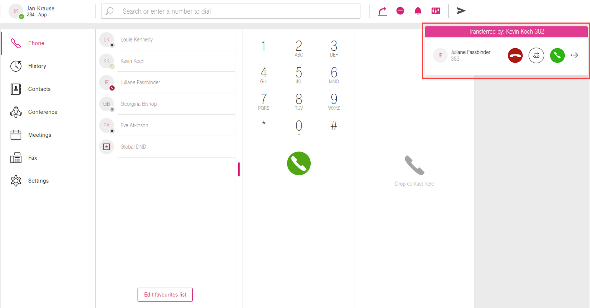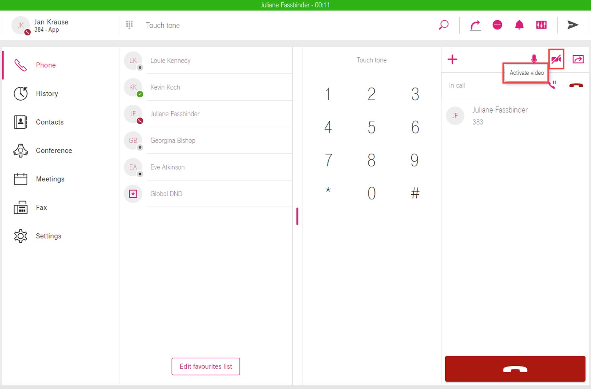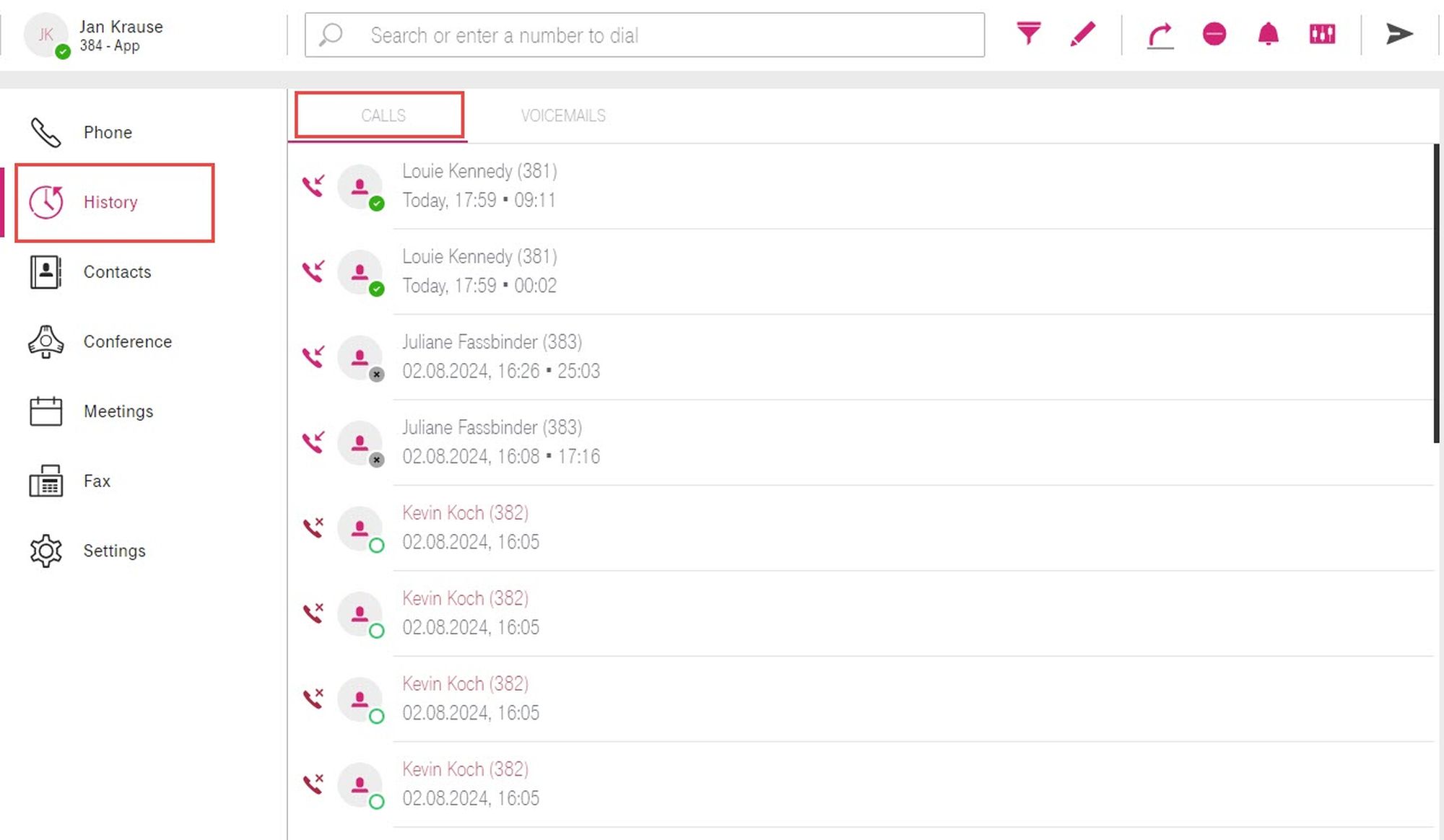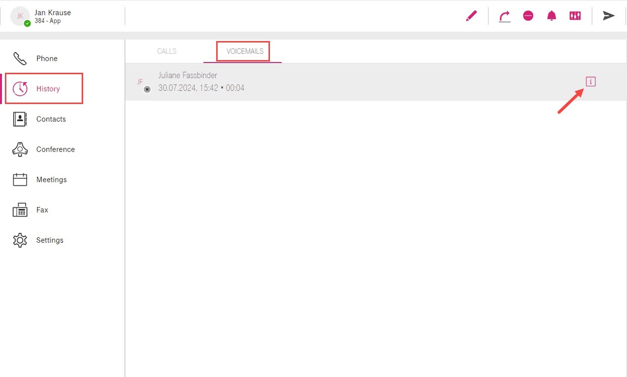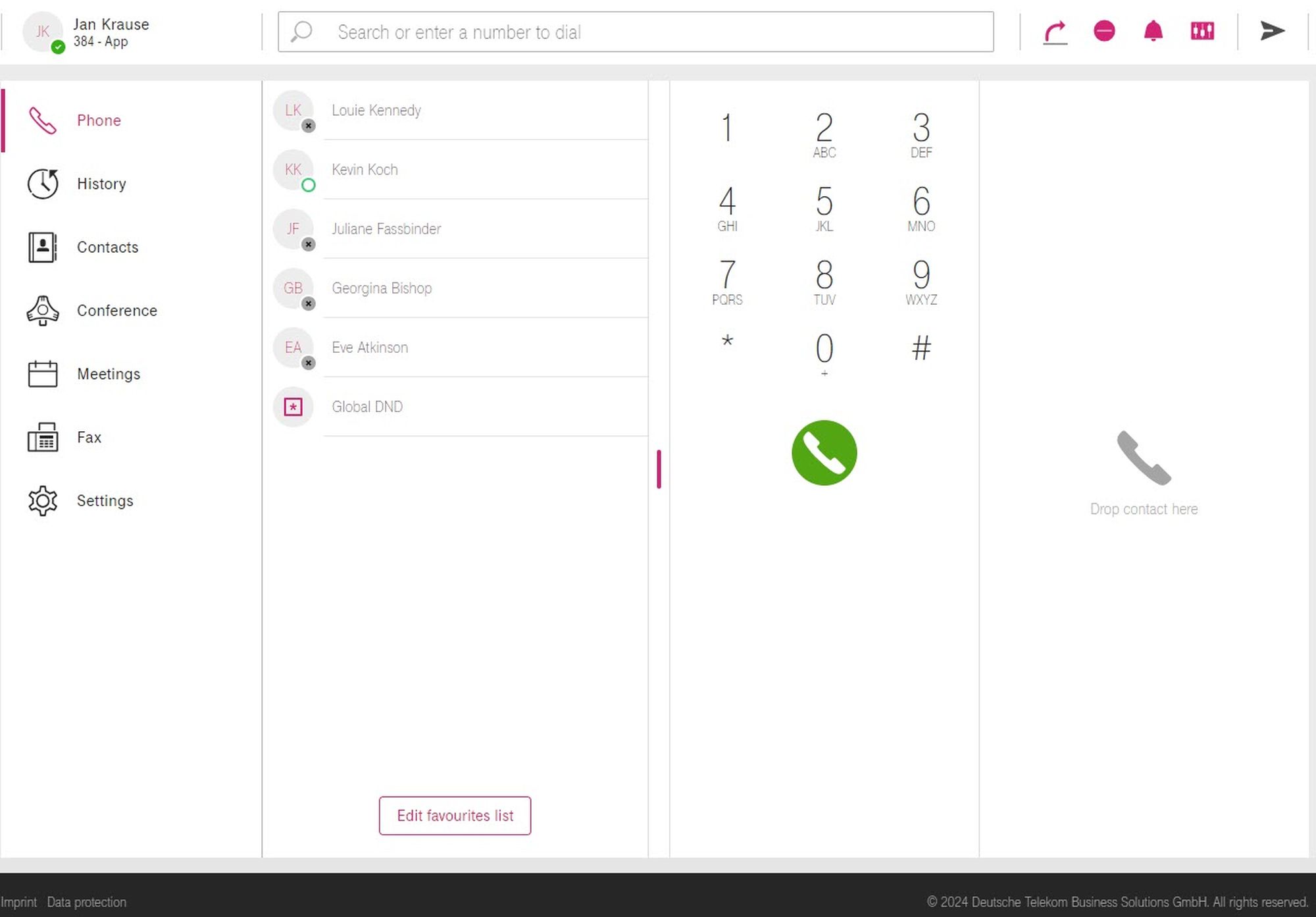 This is done by entering an optional participant ID when dialing in. The participant ID is displayed in the NFON X powered by Telekom App Suite Client on the first device in the meeting information.