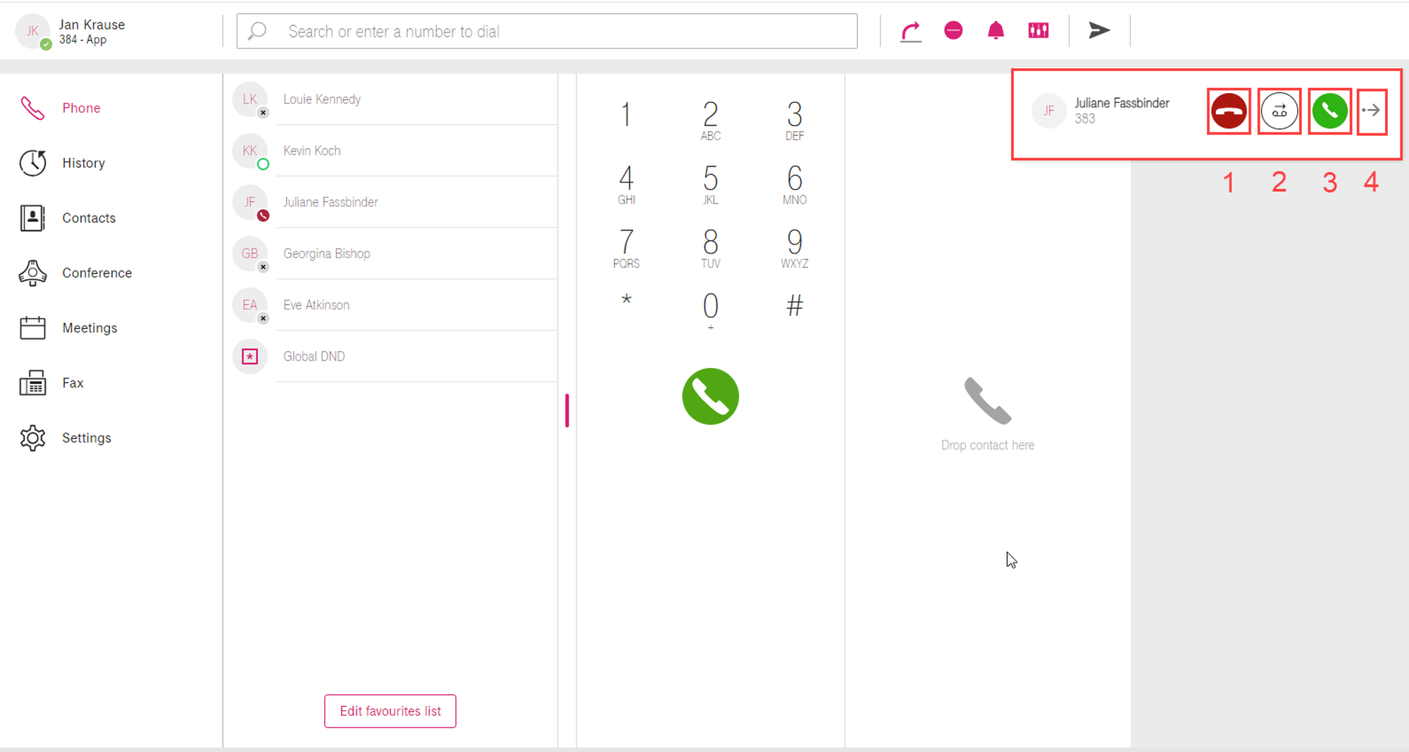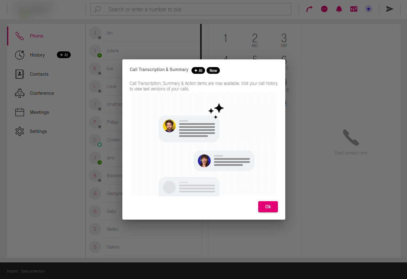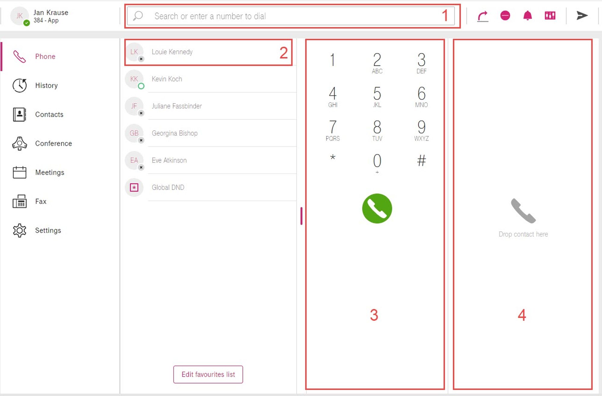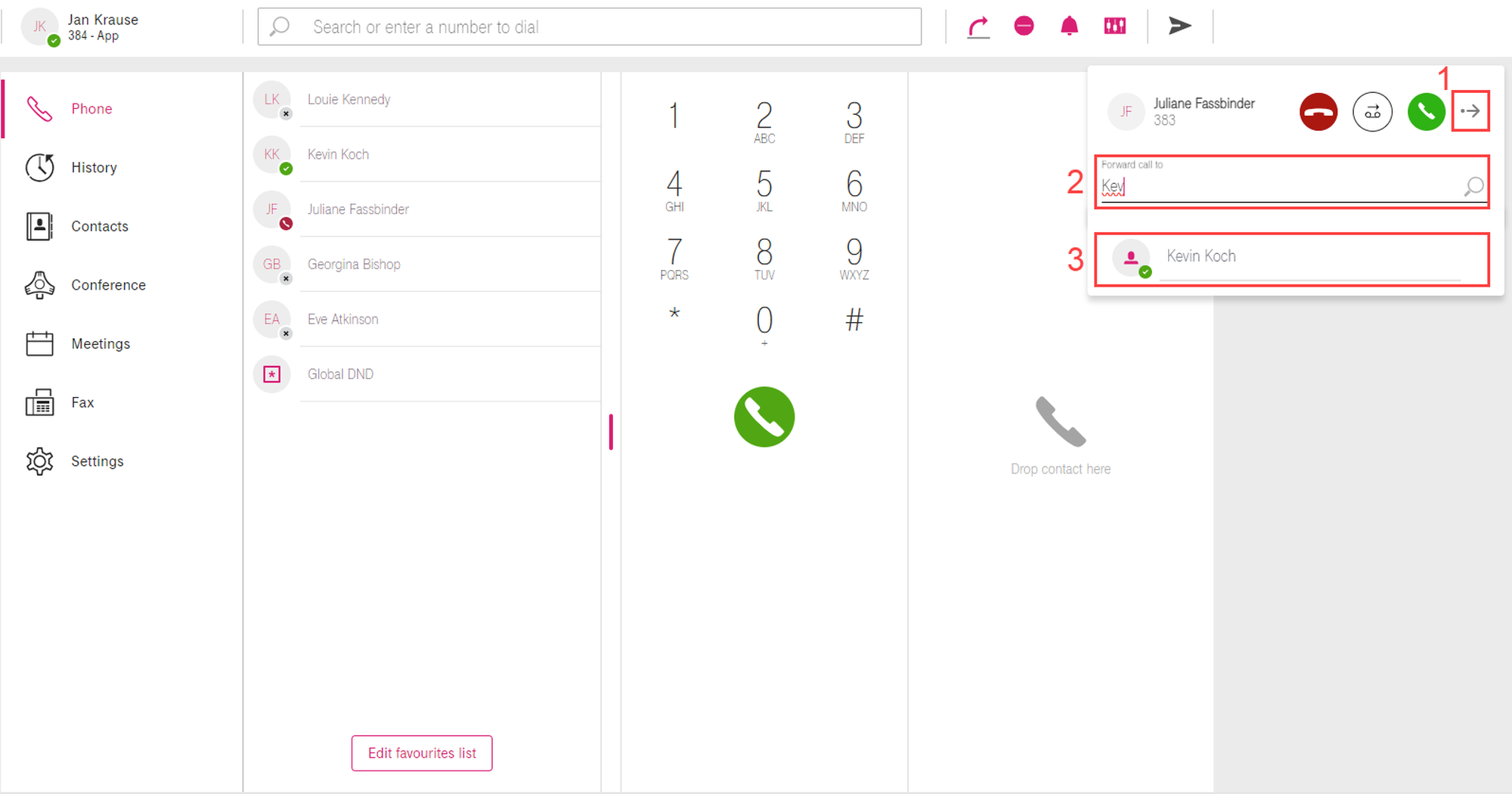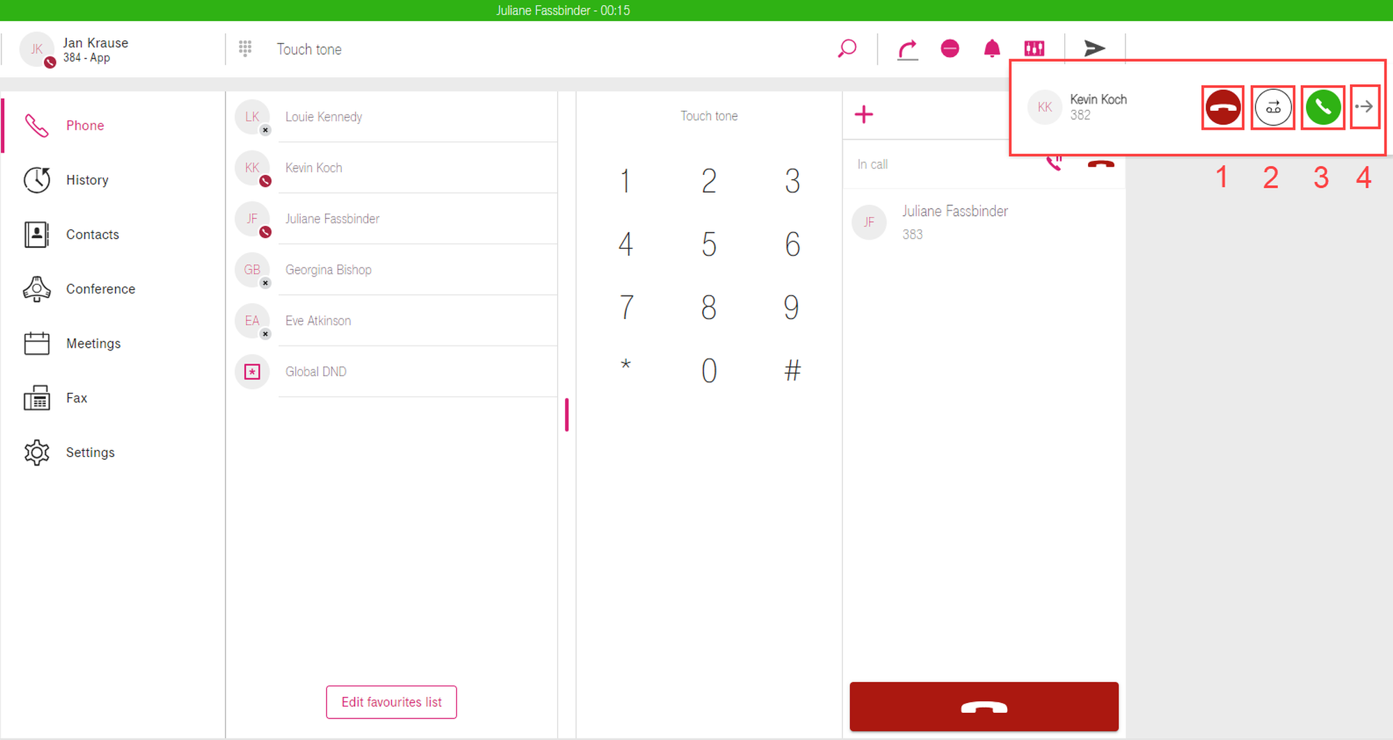This is done by entering an optional participant ID when dialing in. The participant ID is displayed in the NFON X powered by Telekom App Suite Client on the first device in the meeting information.