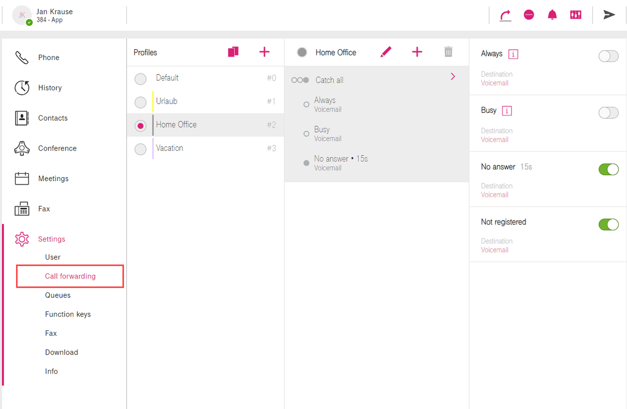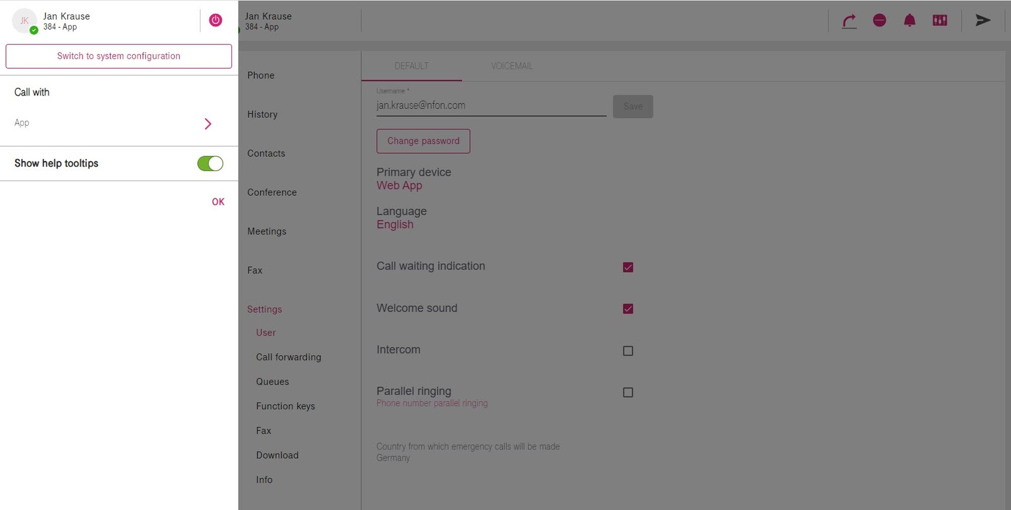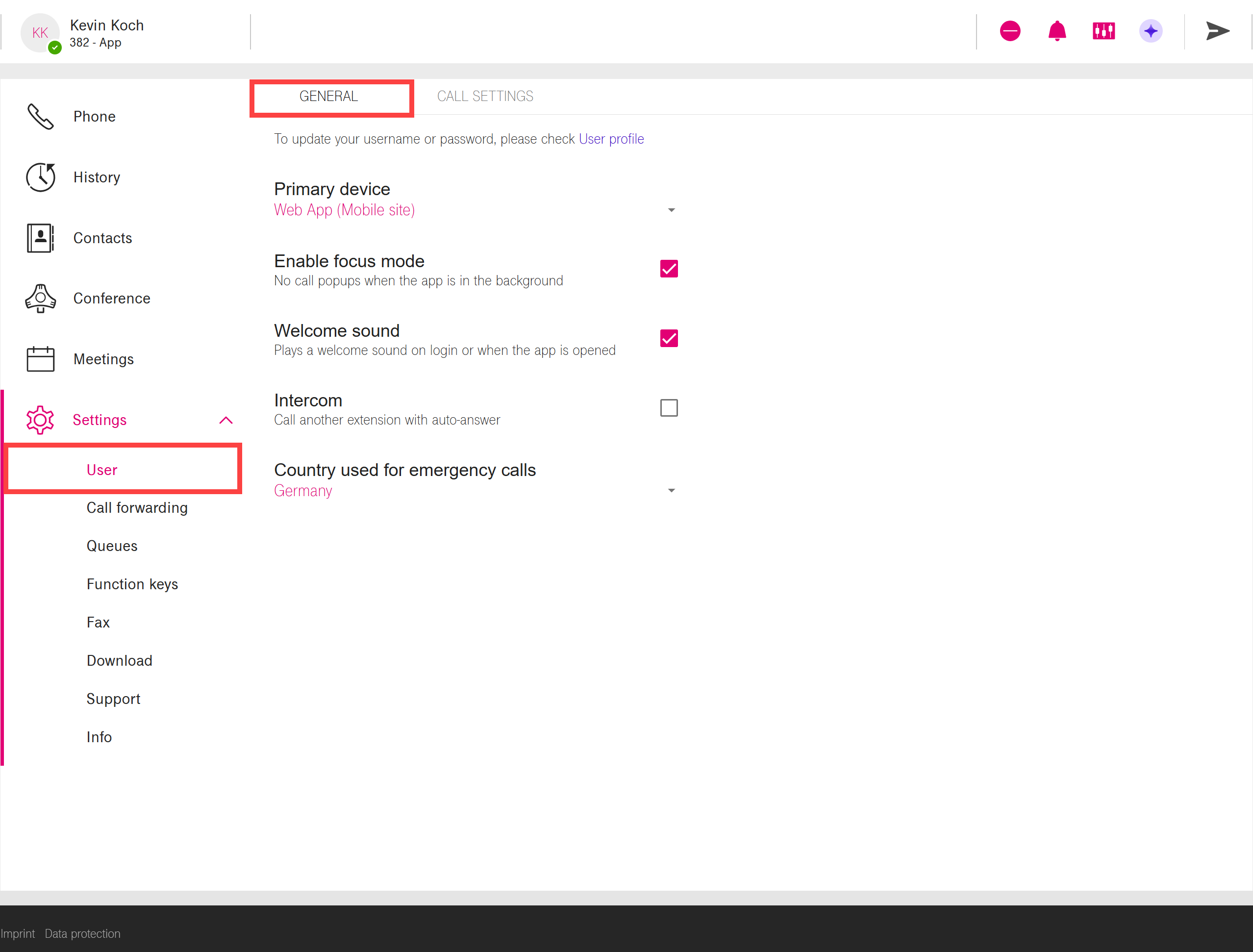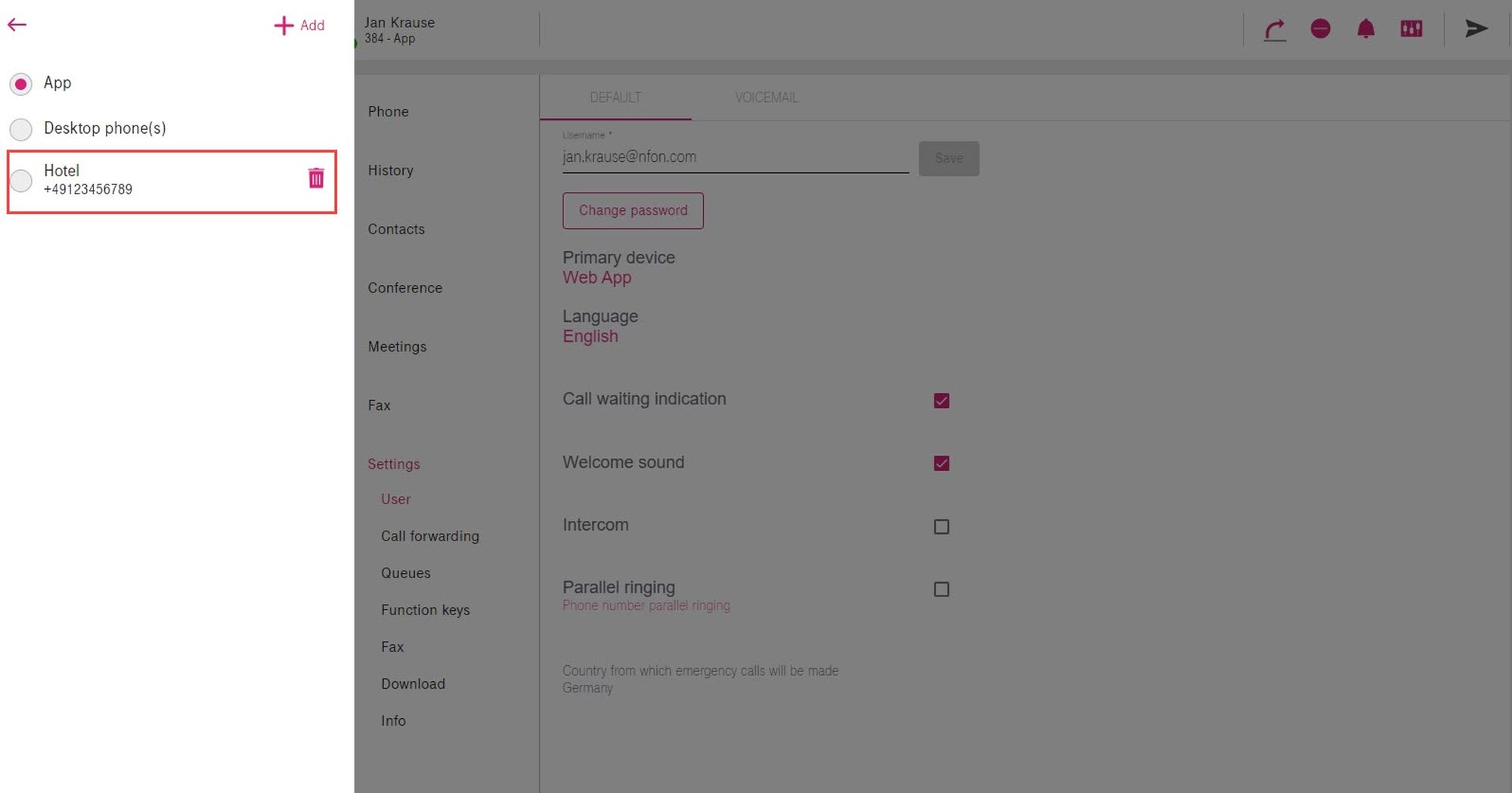 Per default, the app is set as your primary device – the target you will call with. This means, once you have an incoming call, your app will ring. If you want to change this, select a different device.