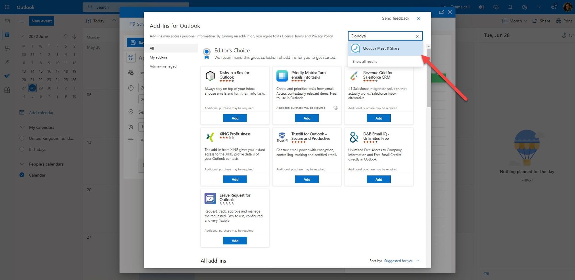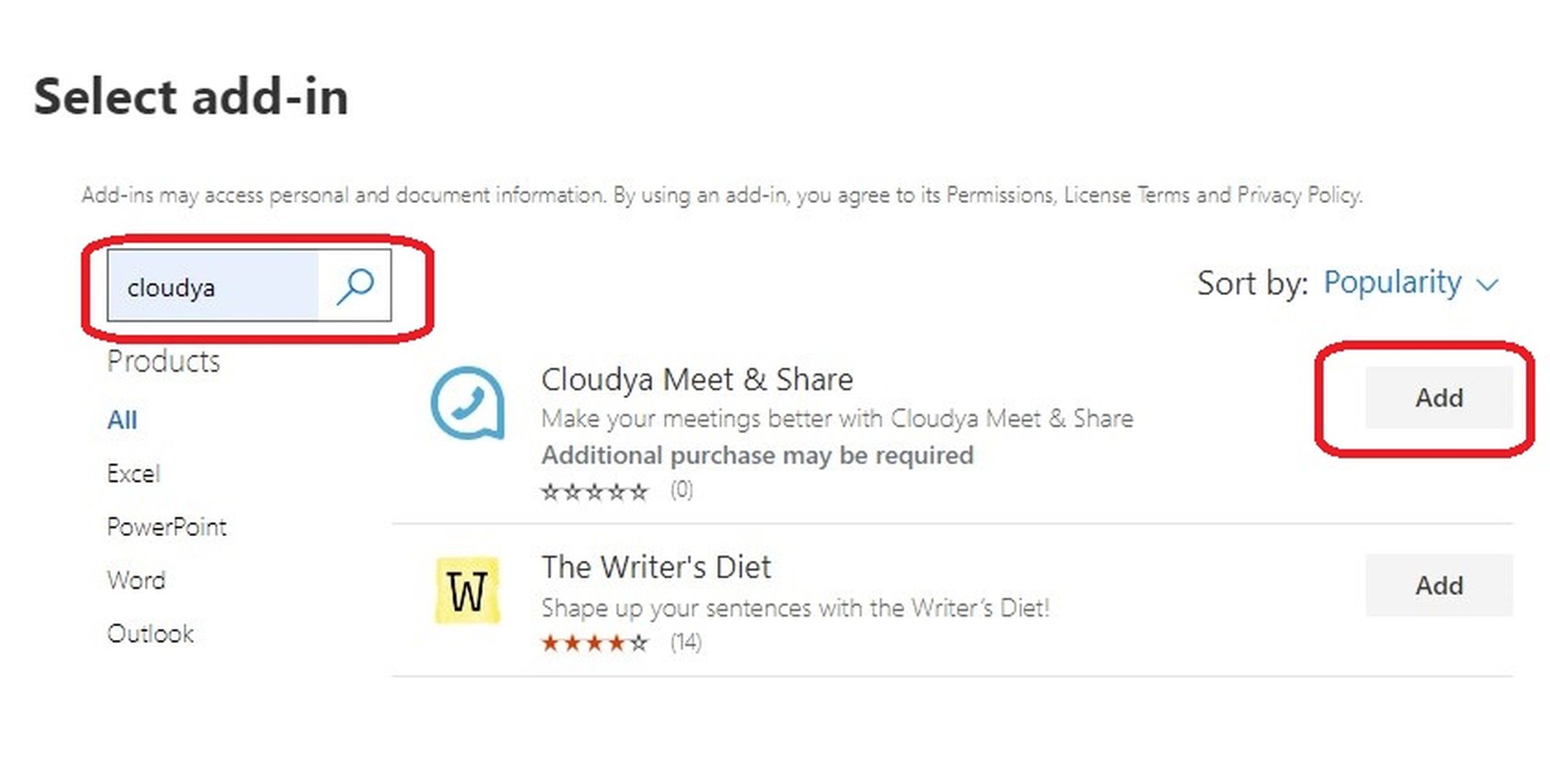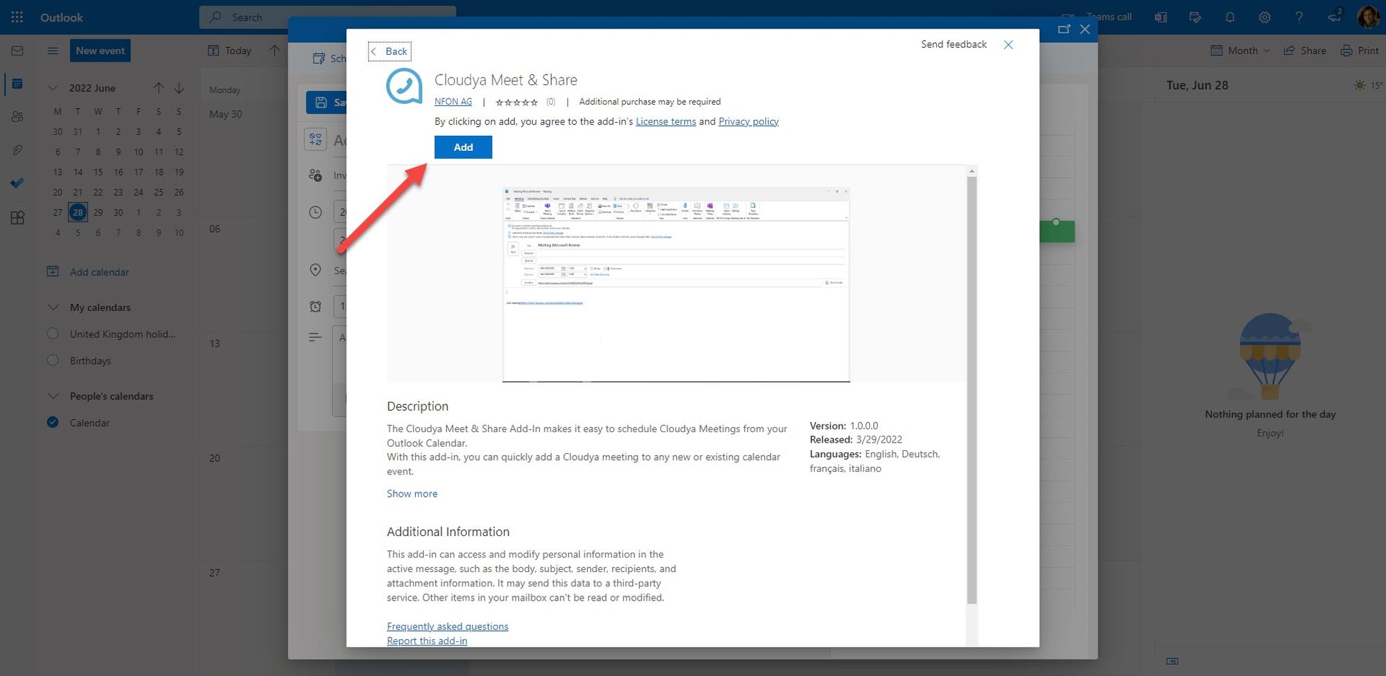 5. Search for "NFON X powered by Telekom Meet & Share" in the store and click on Add. To install the add-in, you have to agree the license terms and privacy policy by clicking on Continue.