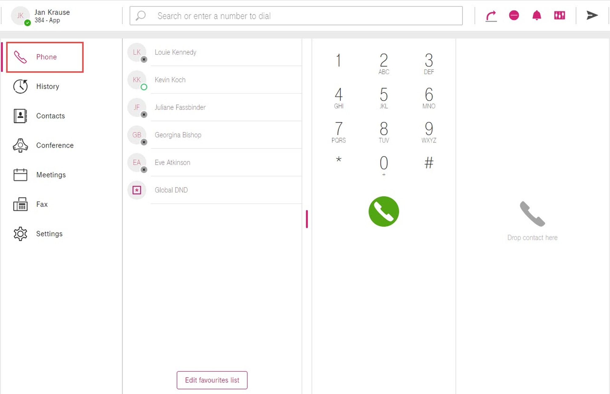 You can make calls using the app, your extension (e.g. your desktop phone) or another device, such as your mobile phone. This feature is called Click to Dial (C2D). Just select the device you want to make a call with, and all your calls will go through that device.