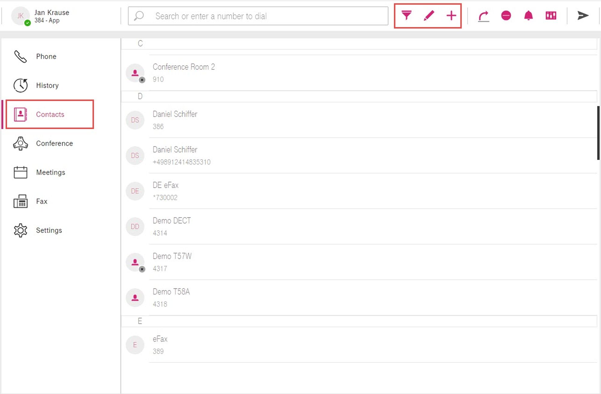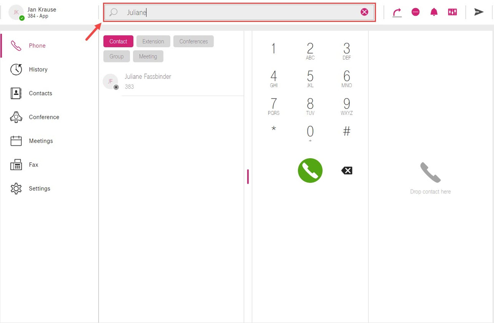 The search bar is used to browse contacts, extensions, conferences, meetings and groups. Search results are clustered into these categories.