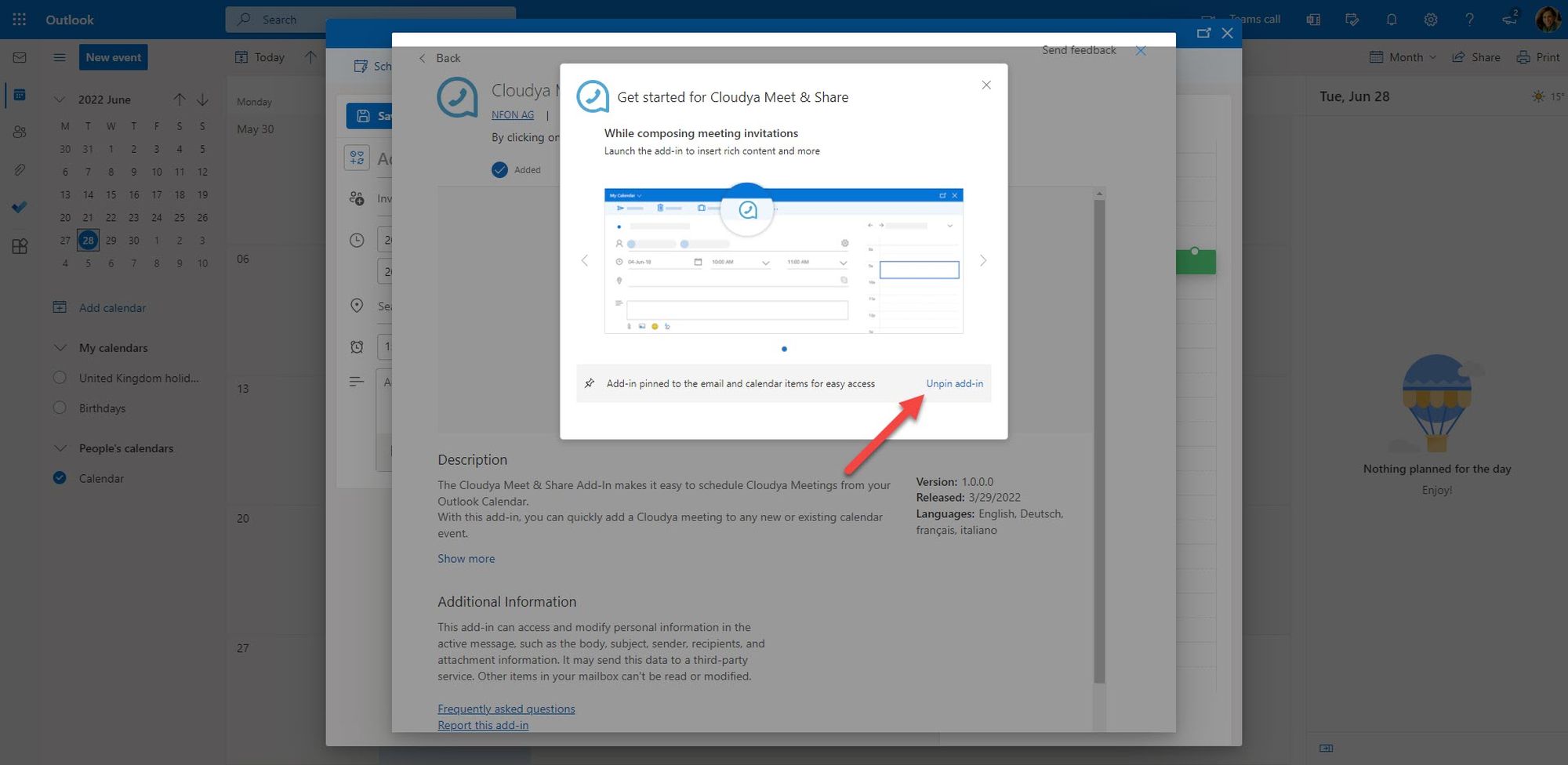 6. You have installed the NFON X powered by Telekom add-in. In addition, you will get a notification about the NFON X powered by Telekom button that has been pinned to your taskbar. If you don’t want the button to be pinned, click on Unpin Add-in in the bottom right-hand corner. You can still use the NFON X powered by Telekom add-in via the options menu.
