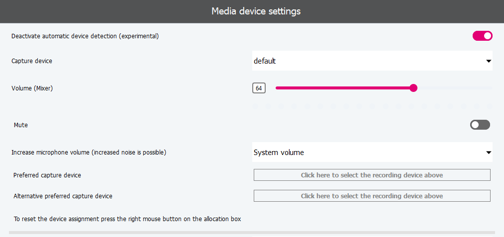 Click Media device settings in the side menu to view a range of media device configuration options.