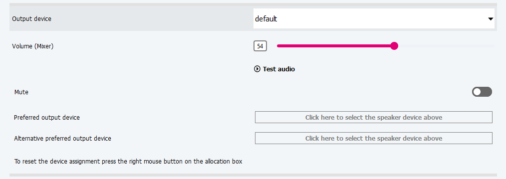 Alternative preferred audio output device | Select an alternative audio output device if the preferred one is not available. (For example, microphone of the notebook) |