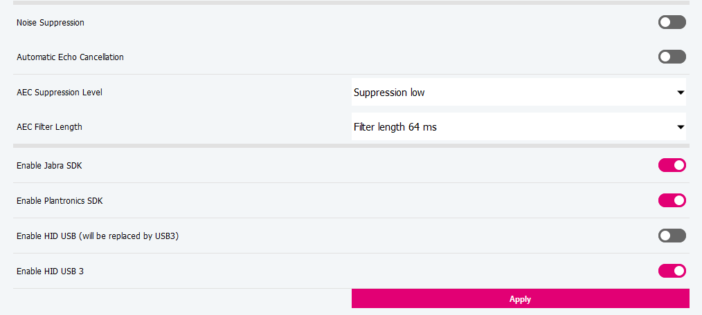 Disable AEC Stream Delay Estimation | Disables automatic AEC stream delay. Will use the delay provided with 'Default for AEC Stream Delay' instead. |