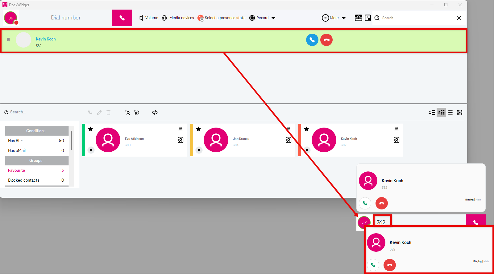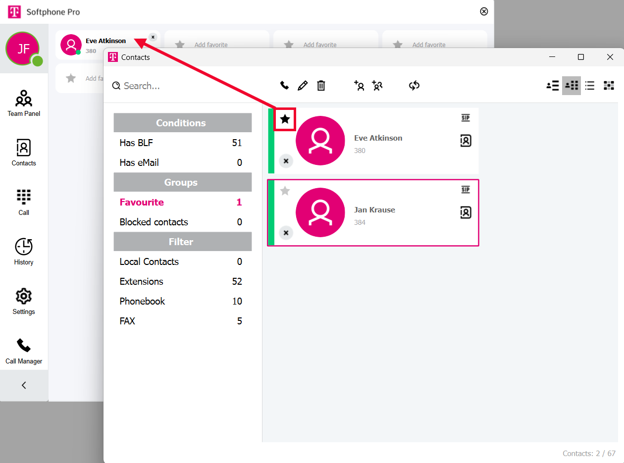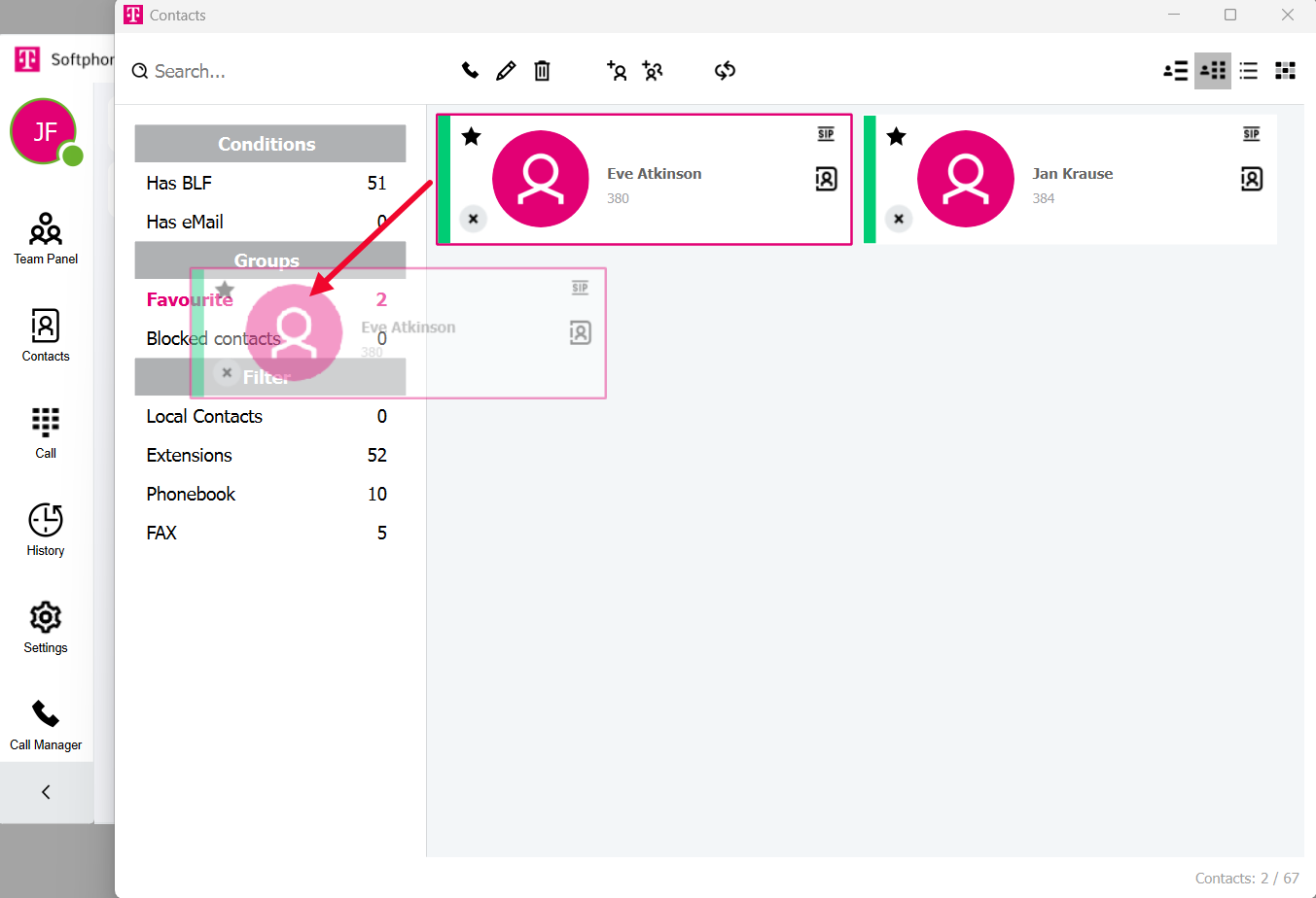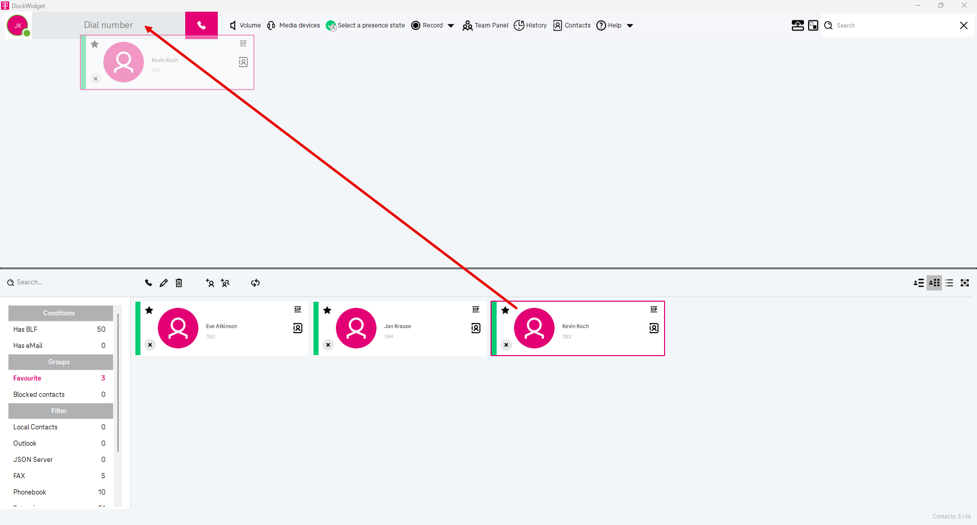 ⇒ The matching results are displayed in the favorites area.Click on the desired contact to open the contact information.