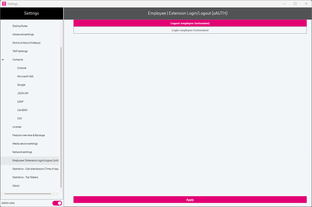 ⇒ Employee | Extension Login/Logout (oAUTH) appears in the side menu.Select Logout employee (extension) or Login employee (extension)