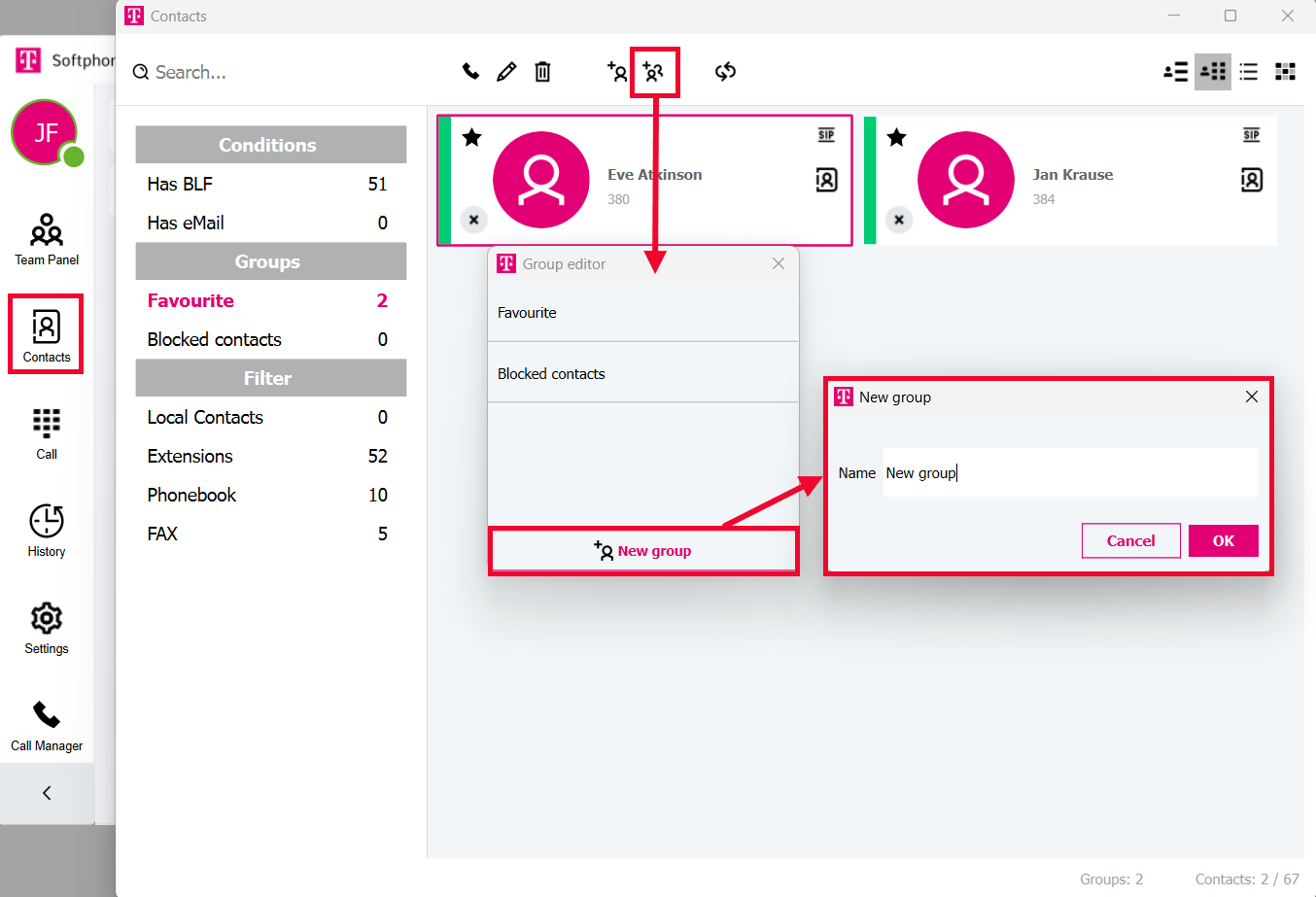 An information bar appears at the top of the screen that displays both contacts and contact groups.Contacts