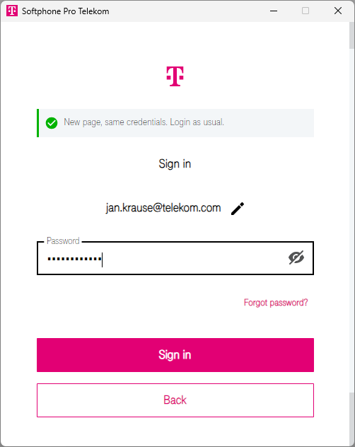⇒ A Login window opens.Enter your NFON X Powered by Telekom email address and password.